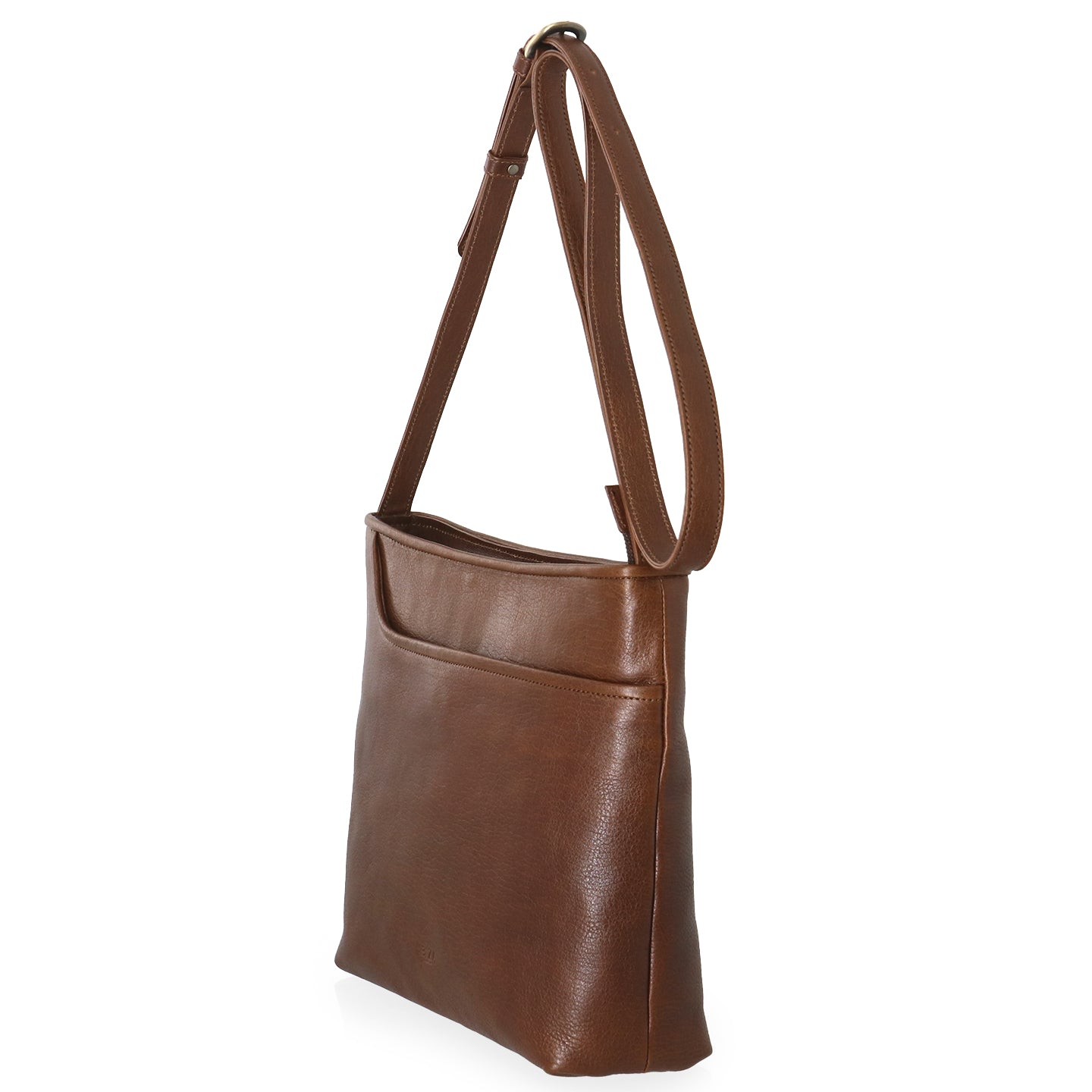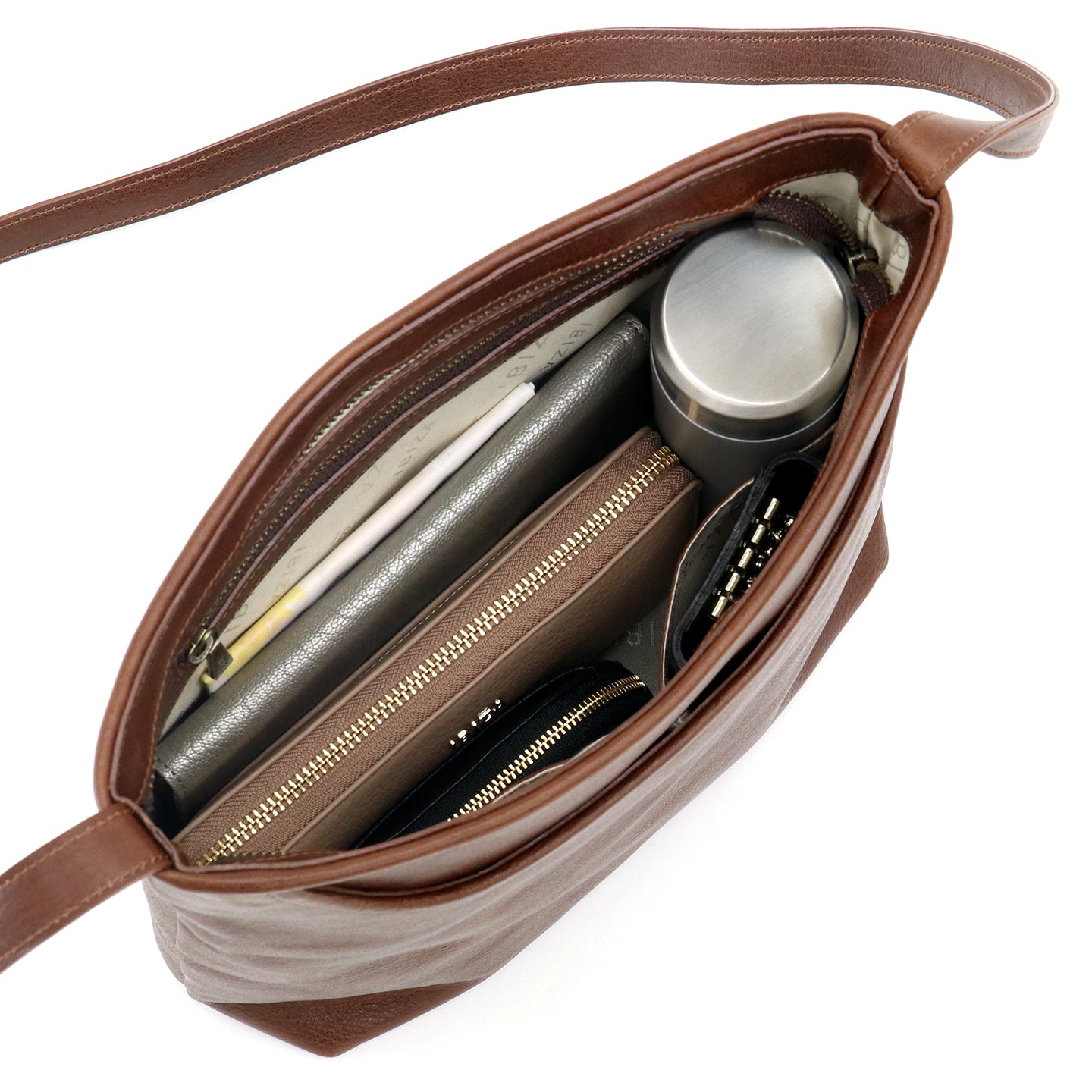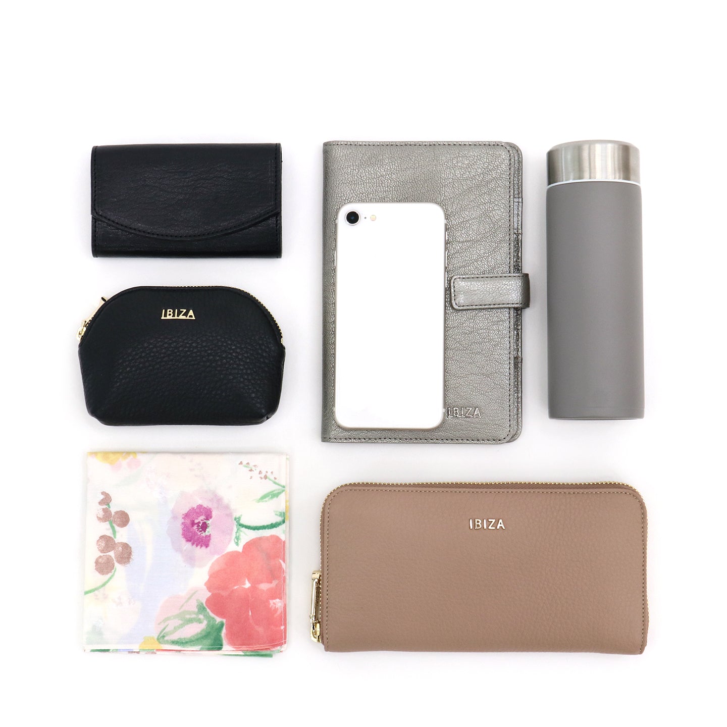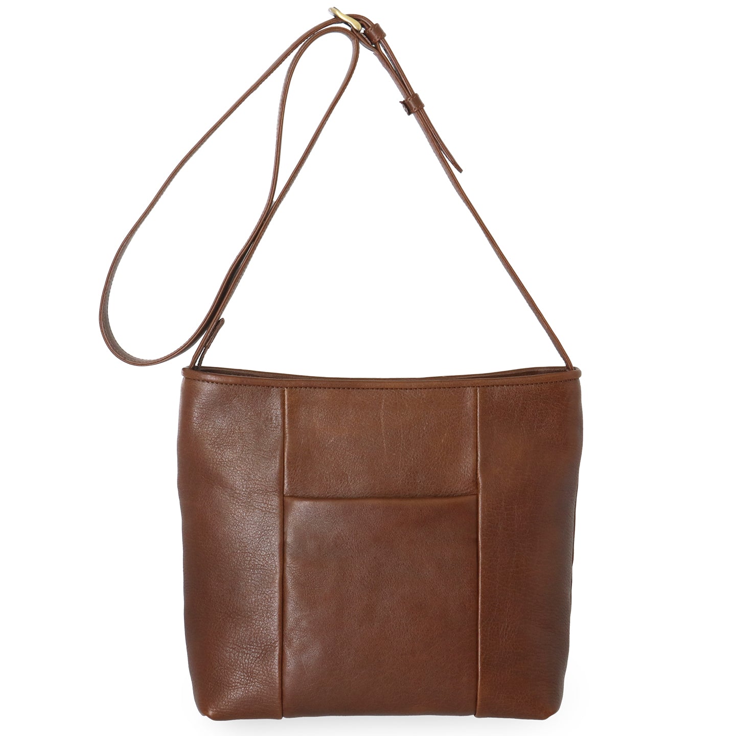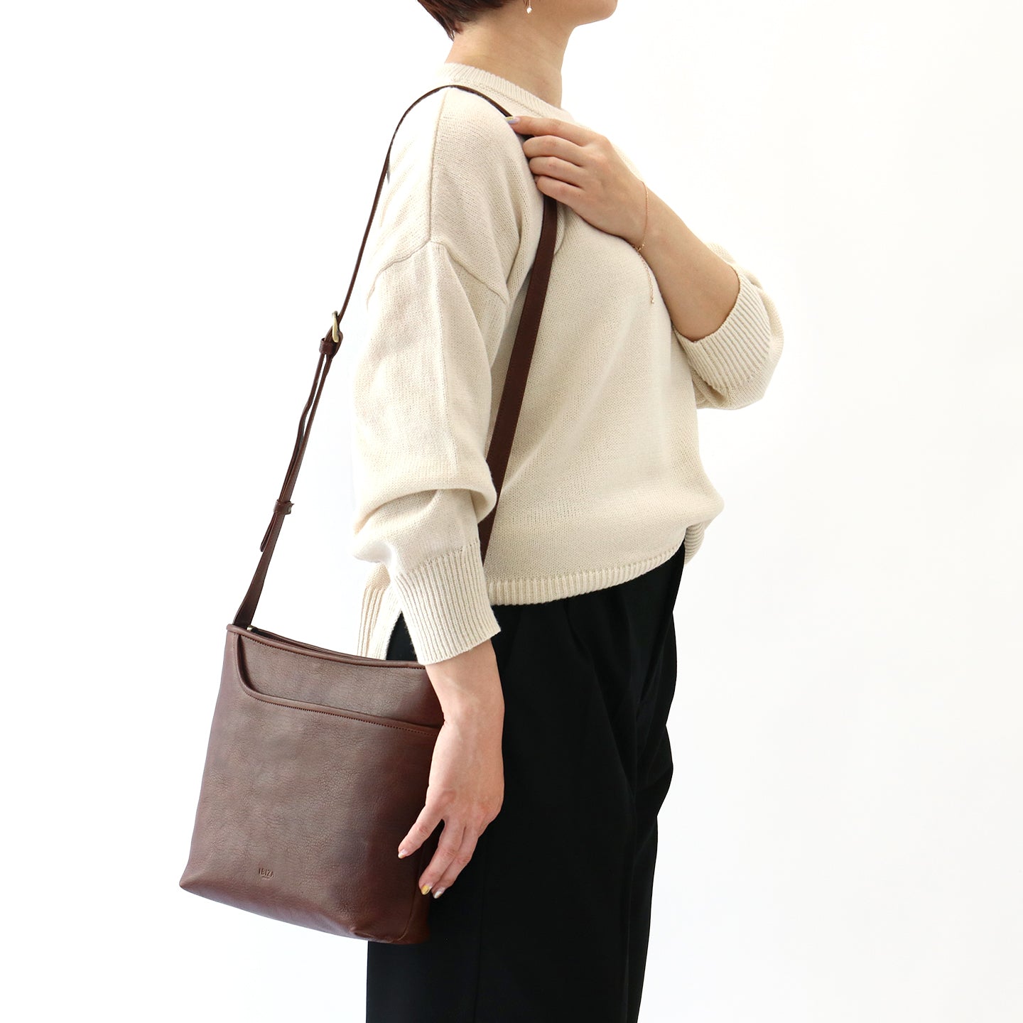 バッグ正面の優しいラインのポケットがデザインポイントで、すっきりと身体に沿うスマートなスクエアフォルムのショルダーバッグ。長財布や小さめのポーチ、ドリンクボトルなどがしっかり収まる実用的なサイズに仕上げました。