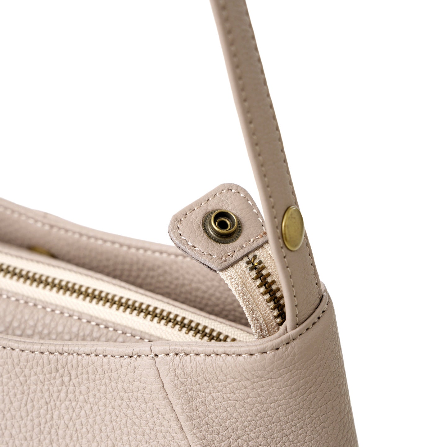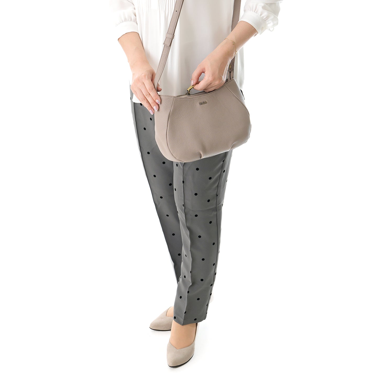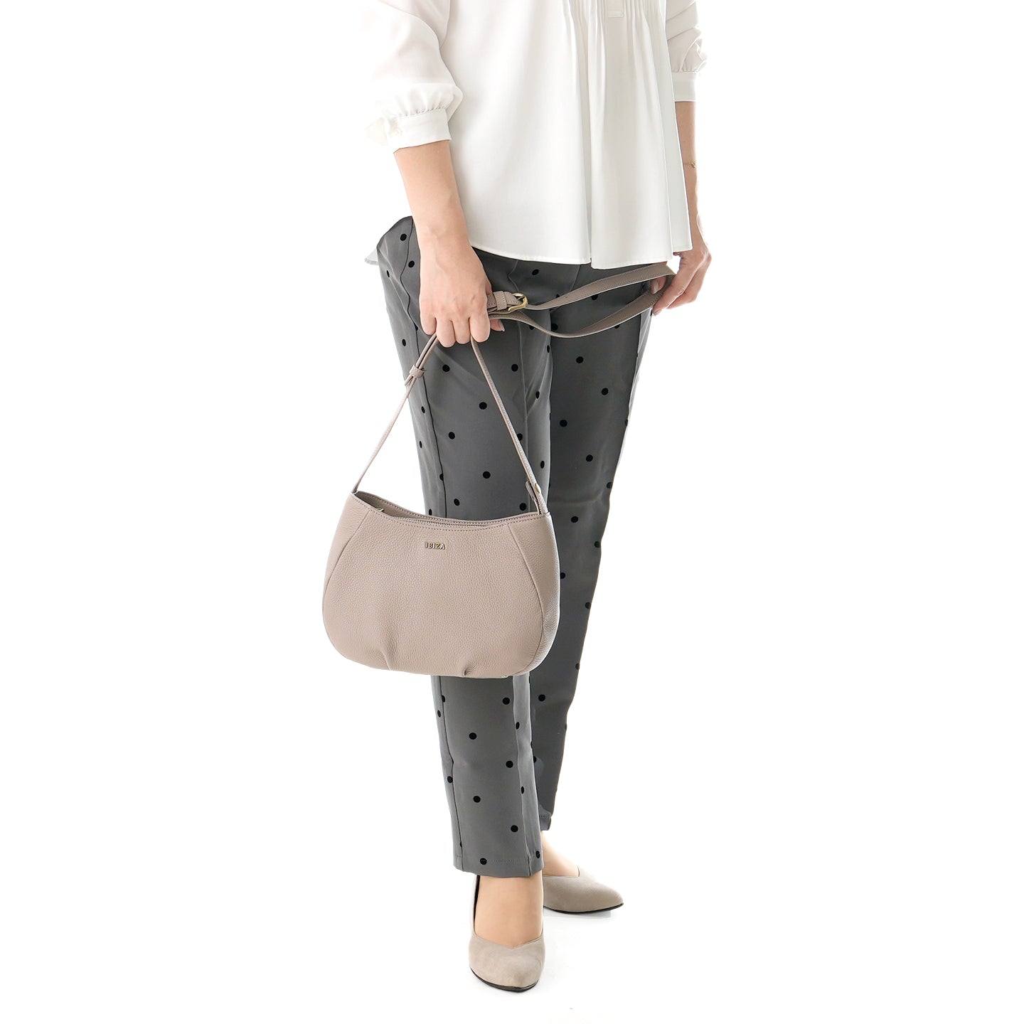 革の程よい艶感ときめ細かいシボ感がコーディネートを上質にみせてくれるショルダーバッグ。タックで柔らかさを演出するなど小技の効いたデザインも魅力です。マチ幅も広くつくられているので見た目以上に物が入るのもうれしいポイント。お財布やスマートフォンなどいつも持ち歩くアイテムはしっかり収納できます。