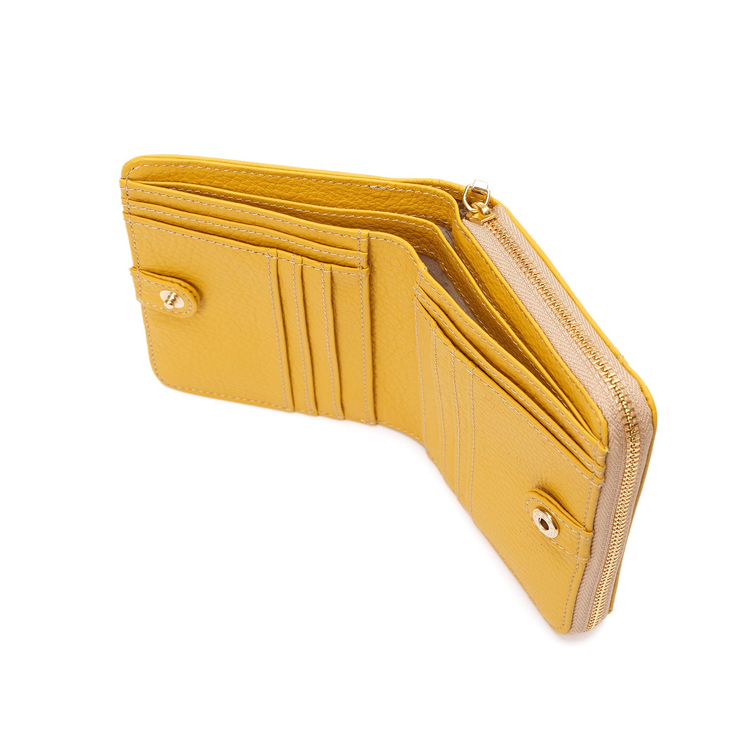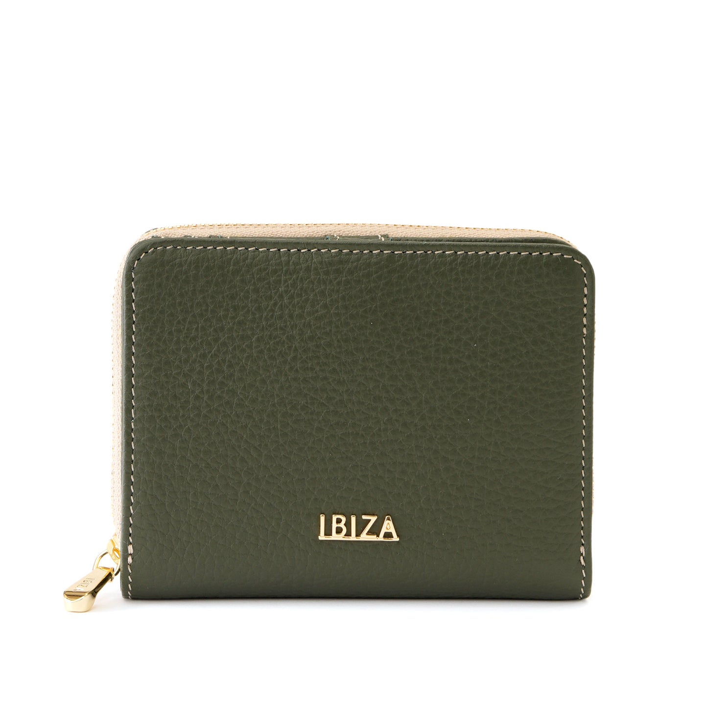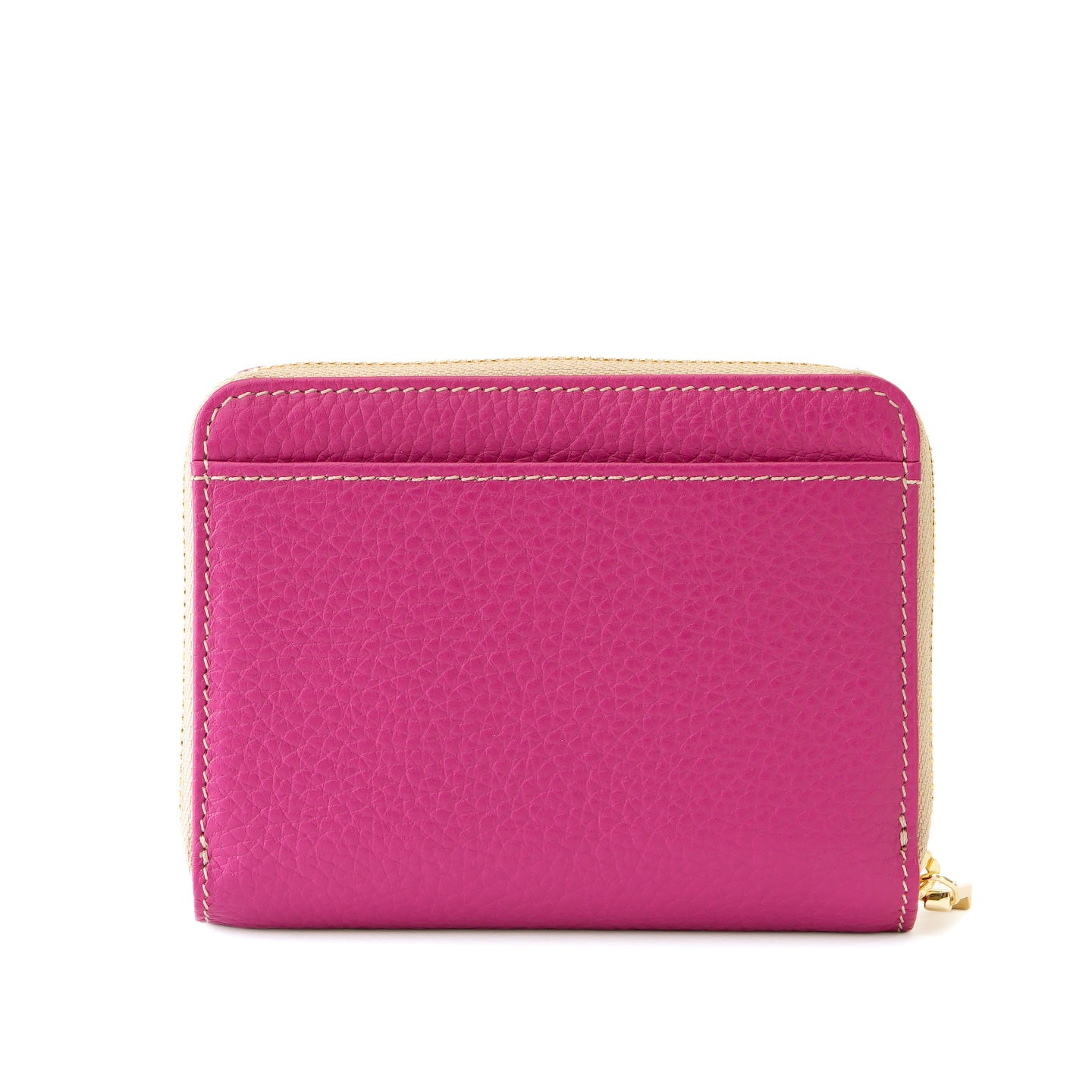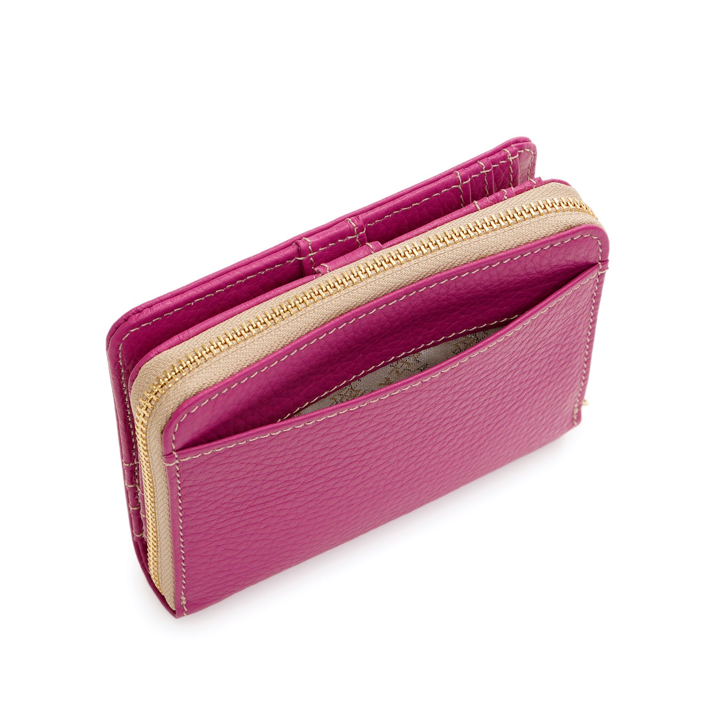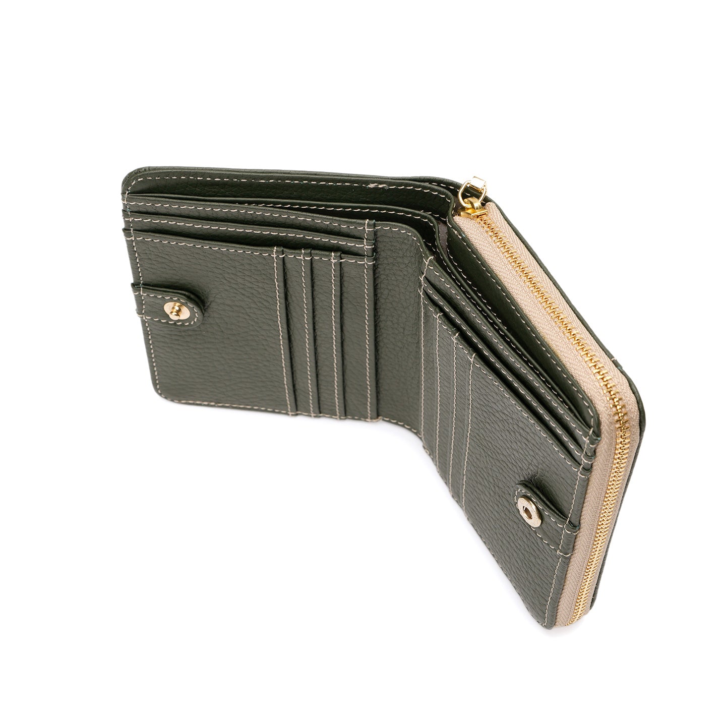 ラウンドファスナー式の小銭入れを備えた二つ折り財布。仕切り付きの札入れや充実したカードポケットを備え、日常使いに必要な収納をすっきりとまとめられる設計です。背面には、よく使うカードをさっと取り出せるオープンポケットを配置しました。