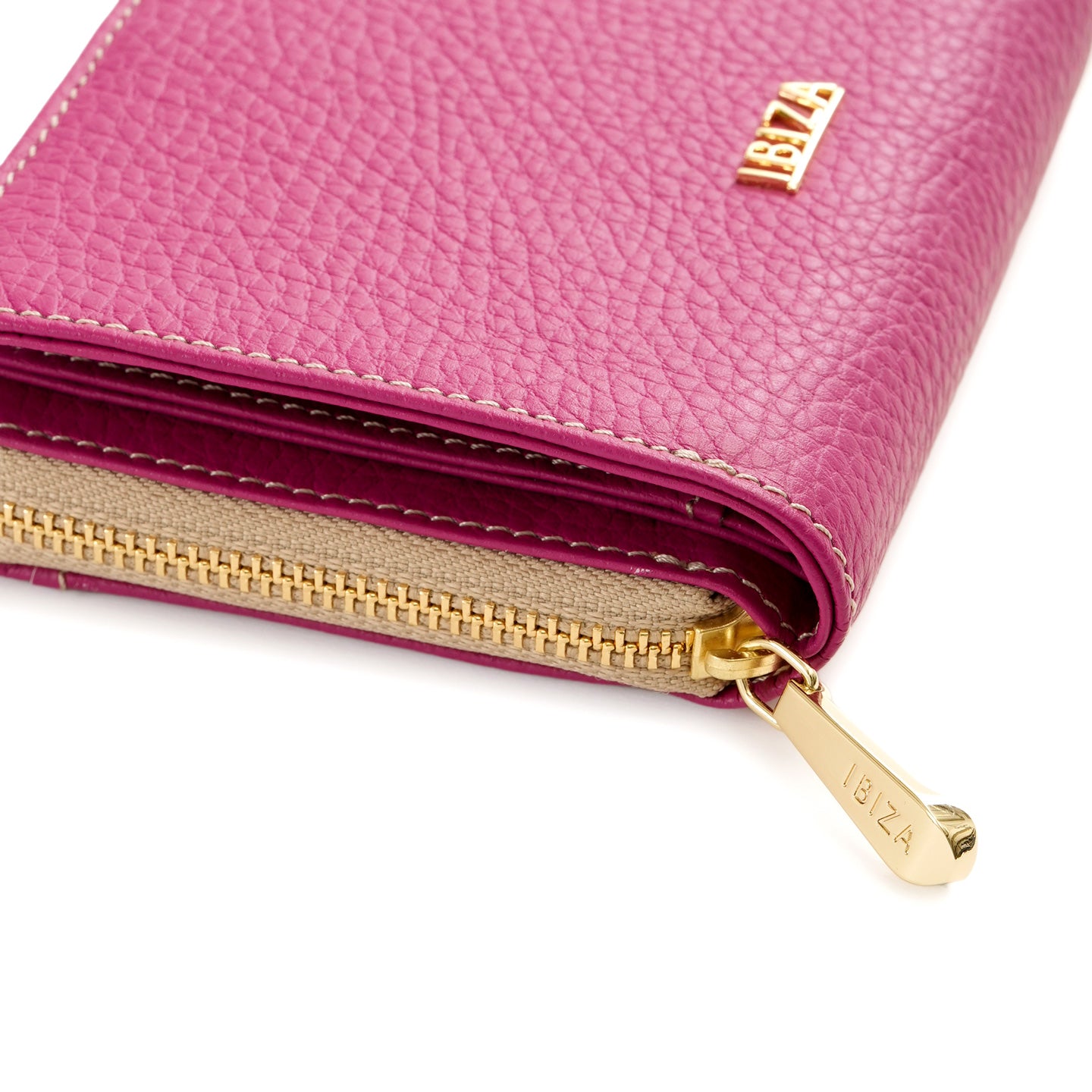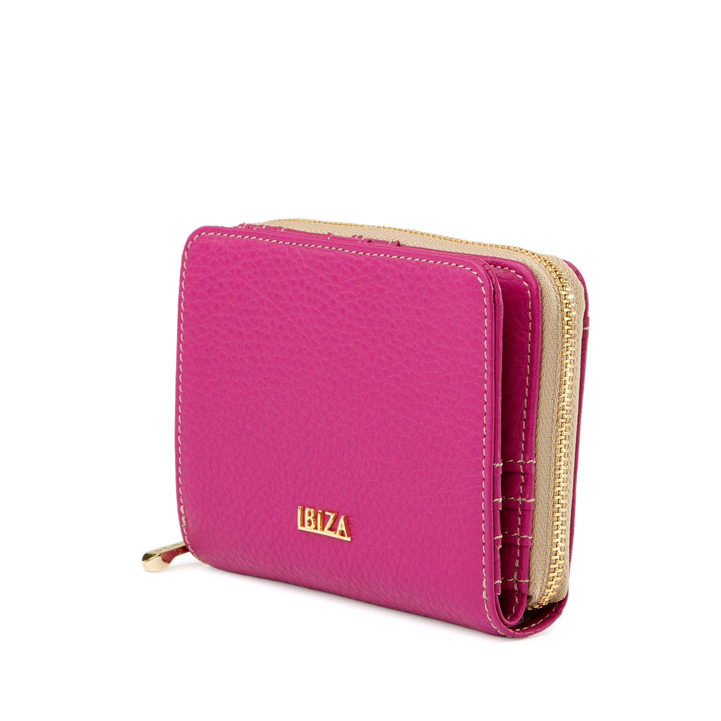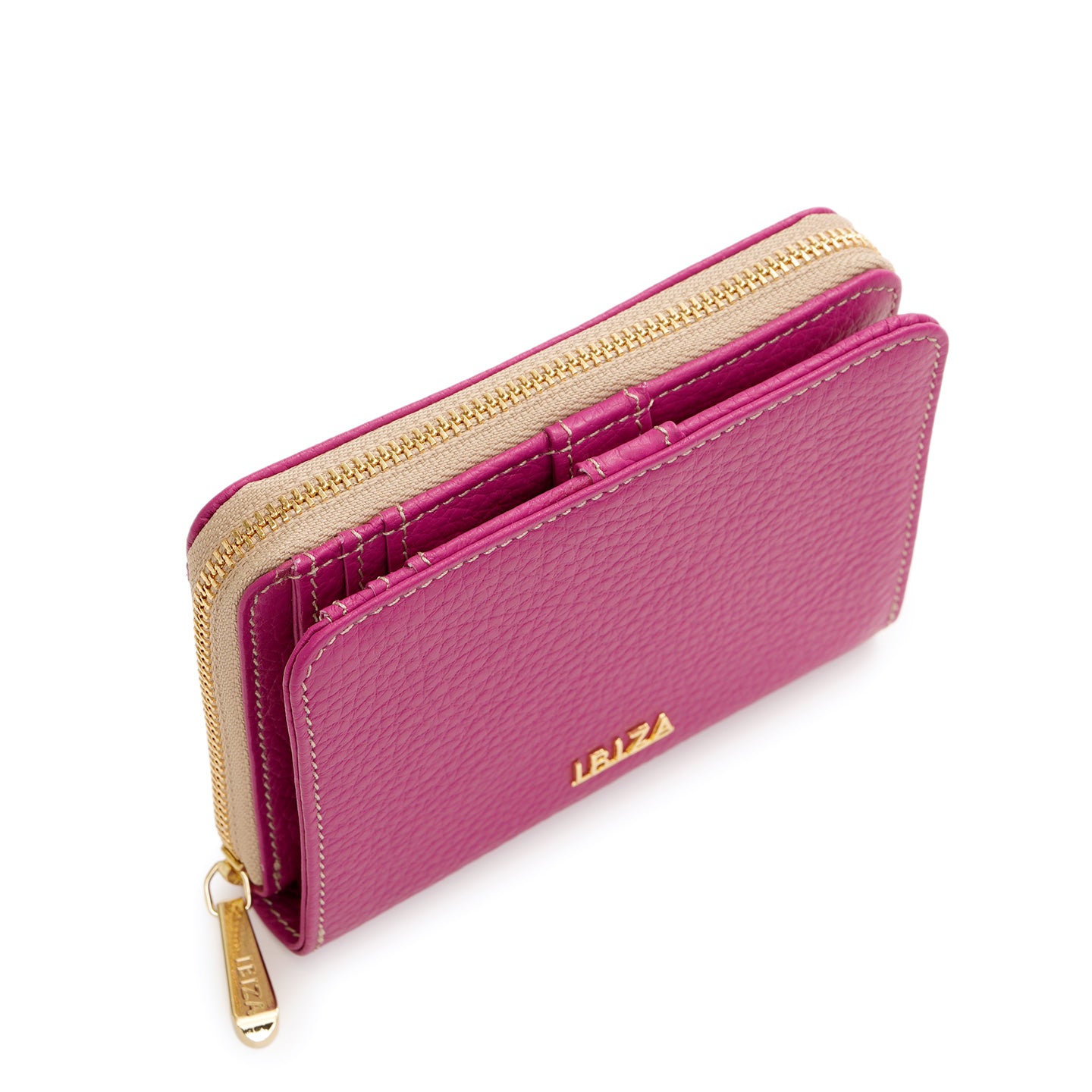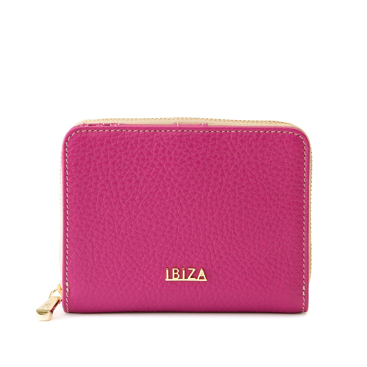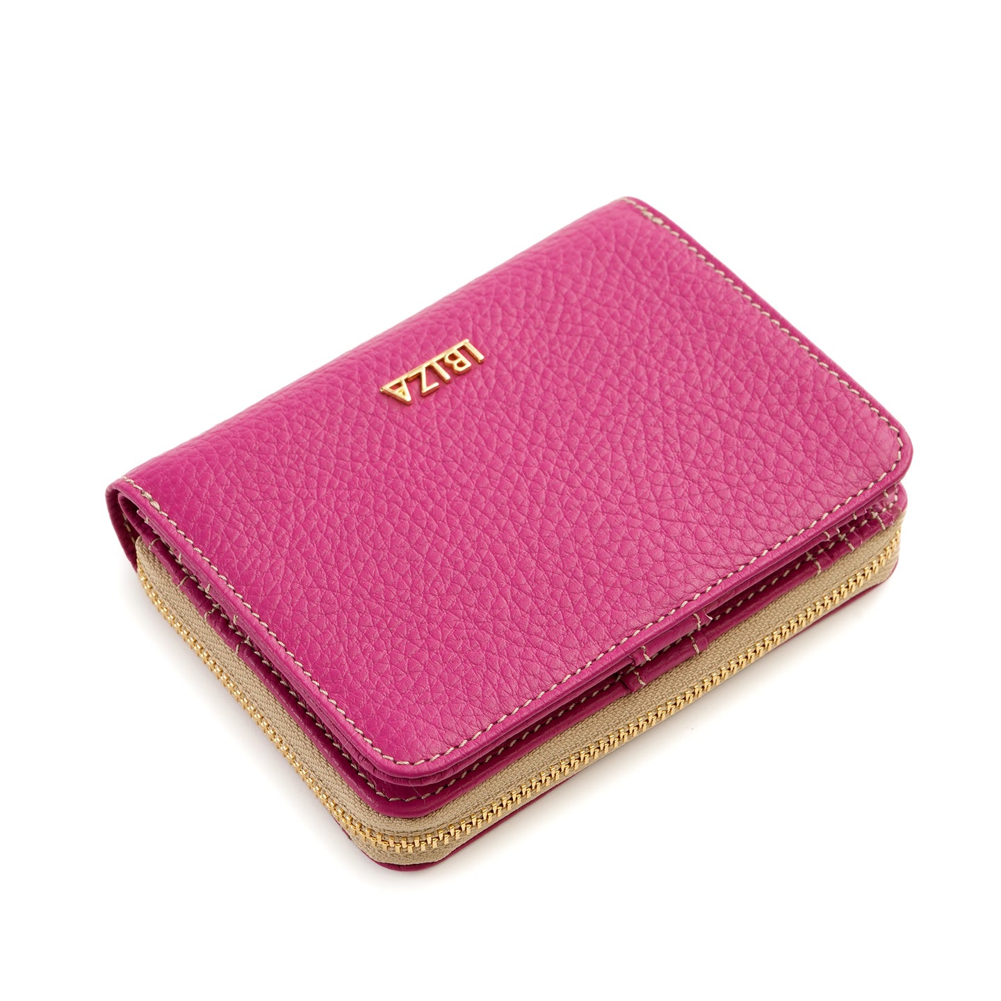 ラウンドファスナー式の小銭入れを備えた二つ折り財布。仕切り付きの札入れや充実したカードポケットを備え、日常使いに必要な収納をすっきりとまとめられる設計です。背面には、よく使うカードをさっと取り出せるオープンポケットを配置しました。