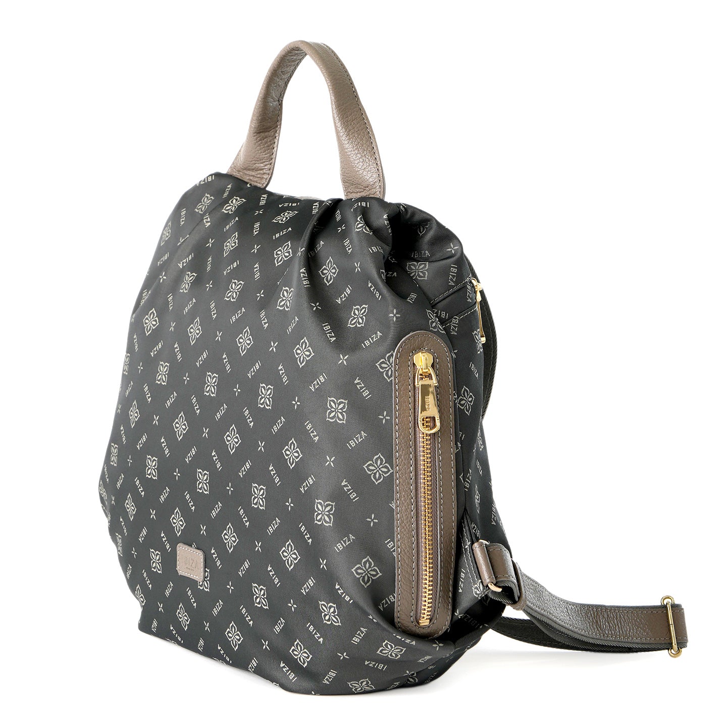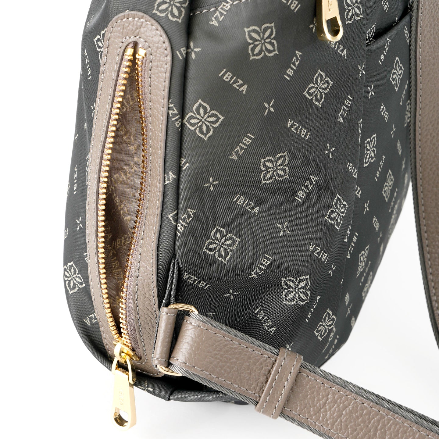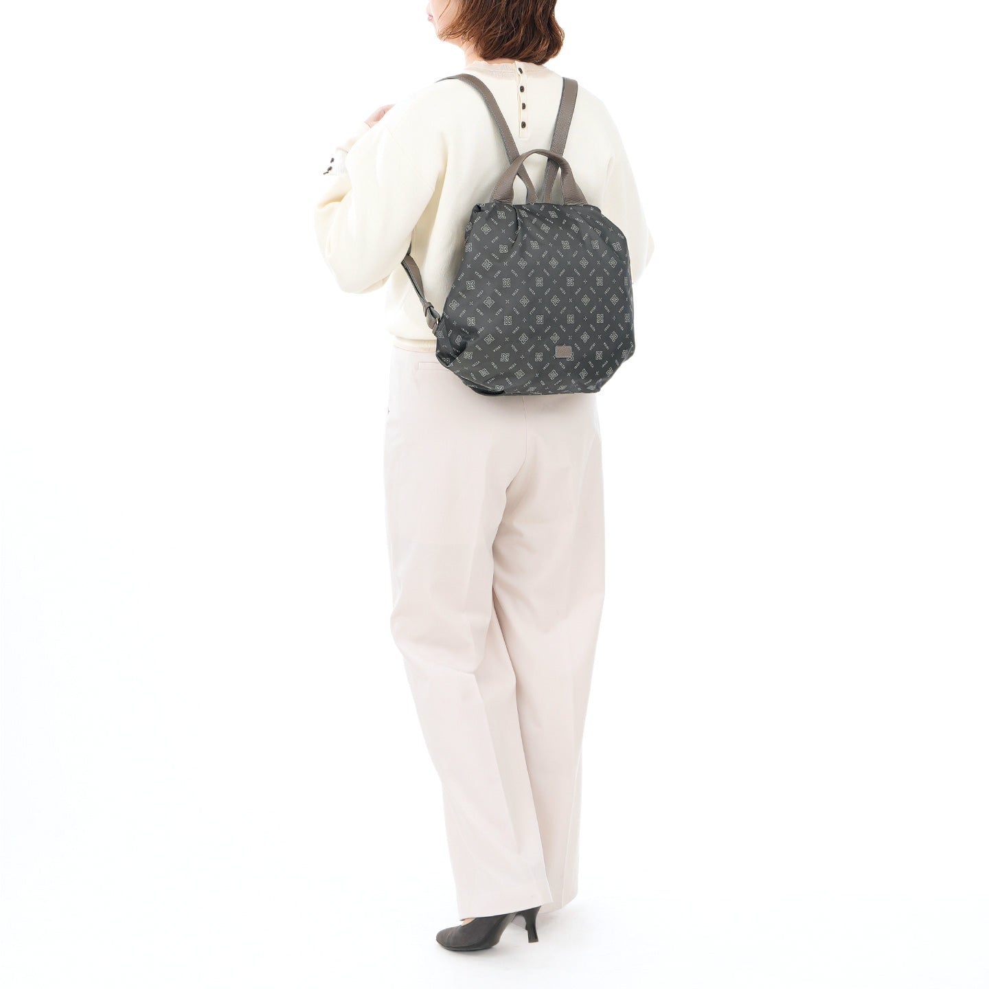 福井県で丁寧に織り上げたナイロンテキスタイルに、オリーブの花とブランドロゴを組み合わせたモノグラムを織り込んだリュックです。織り模様が生むさりげない艶感と、タックを寄せた立体的なフォルムがやわらかさを添え、軽やかな印象を引き立てます。