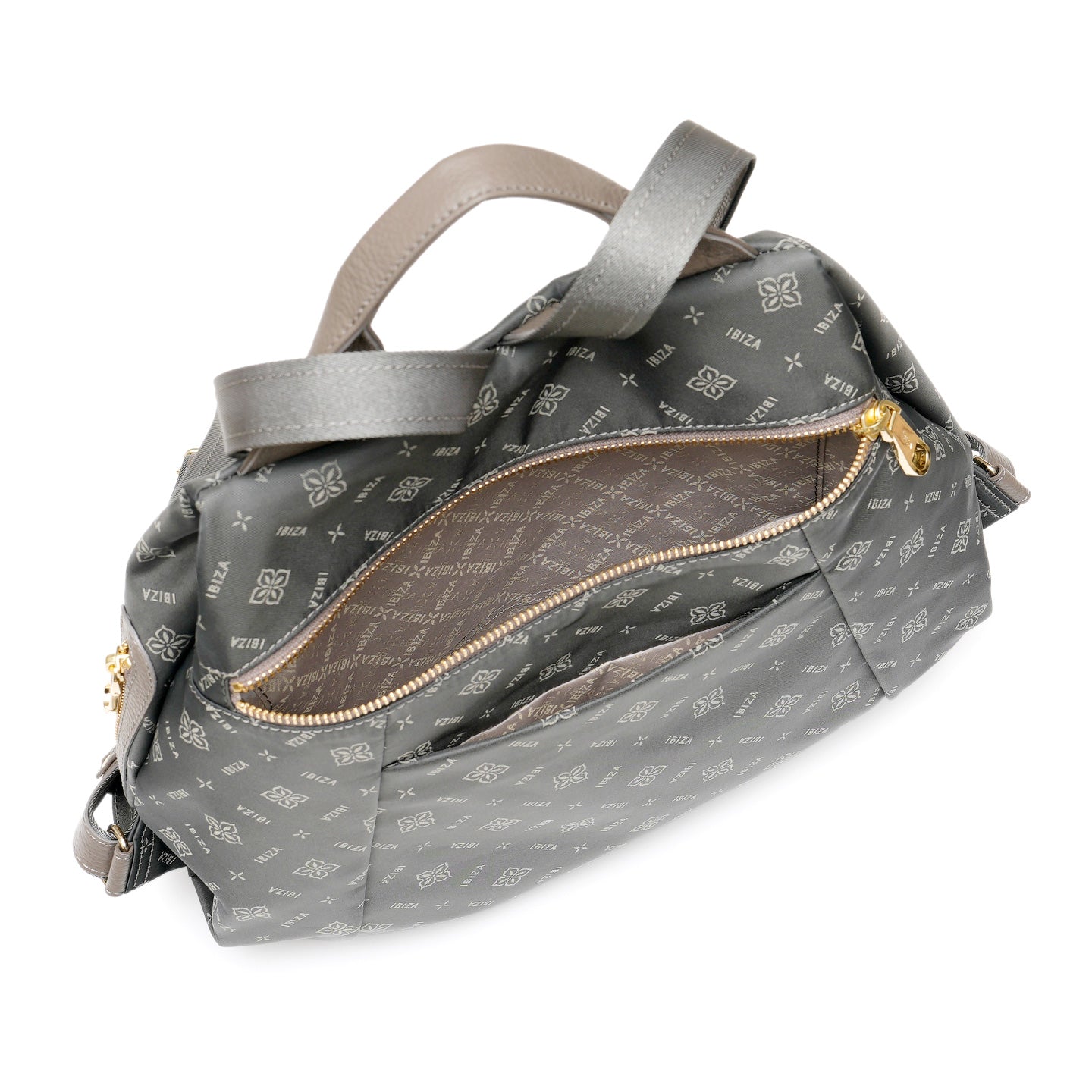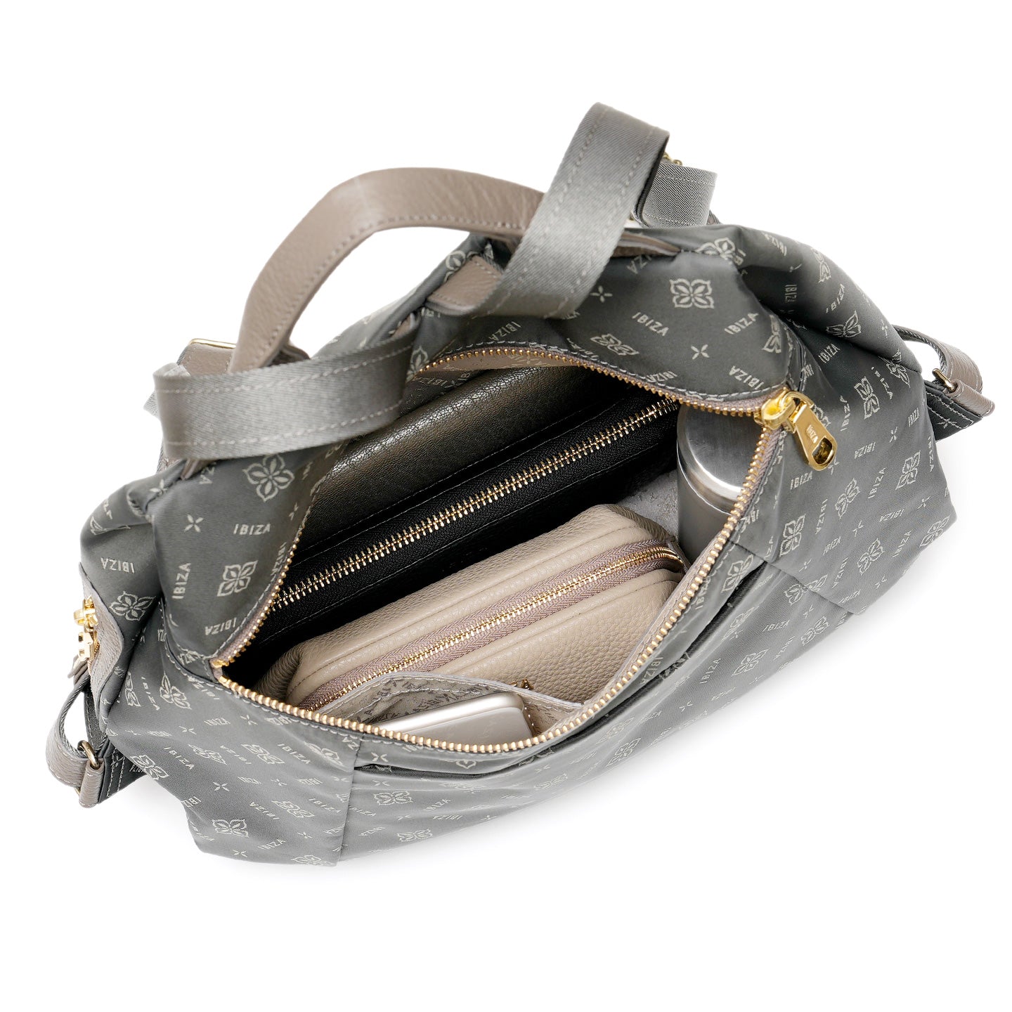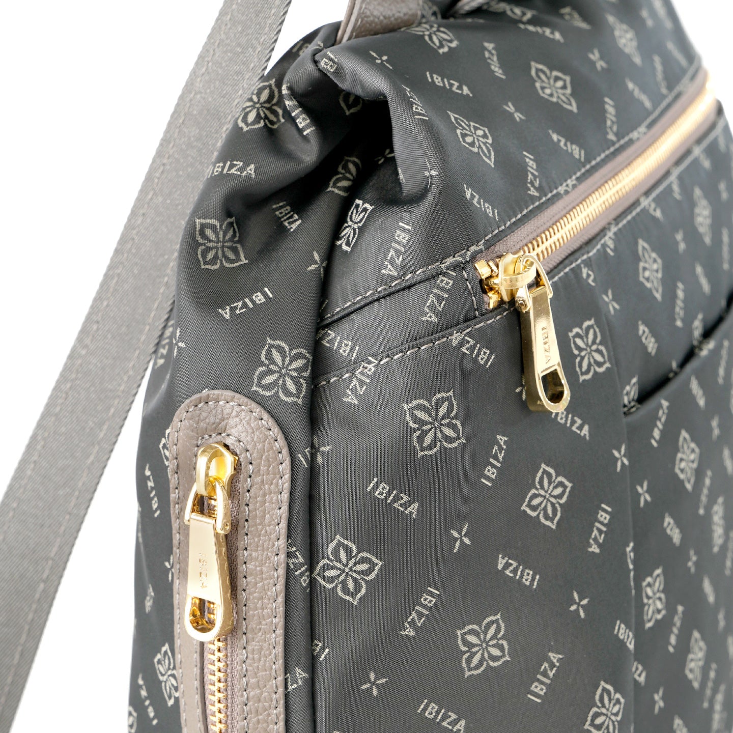 福井県で丁寧に織り上げたナイロンテキスタイルに、オリーブの花とブランドロゴを組み合わせたモノグラムを織り込んだリュックです。織り模様が生むさりげない艶感と、タックを寄せた立体的なフォルムがやわらかさを添え、軽やかな印象を引き立てます。