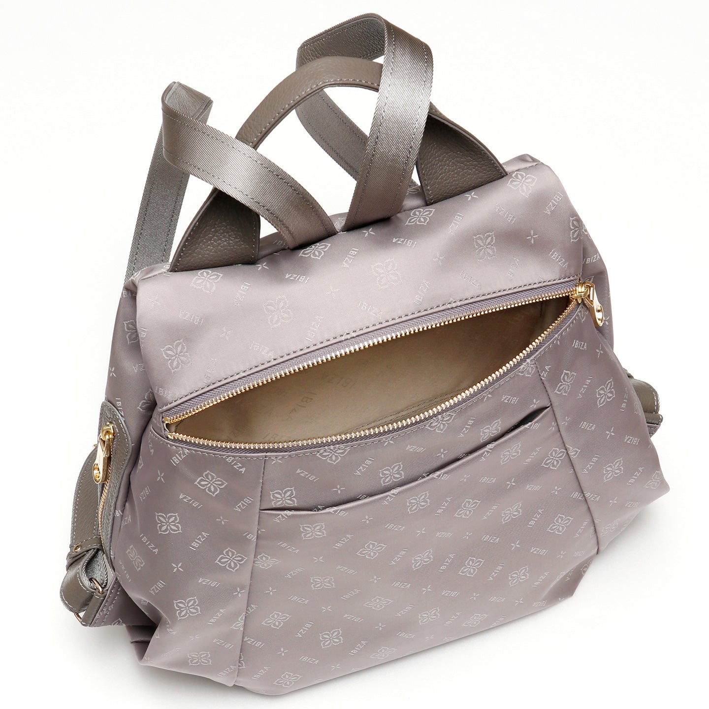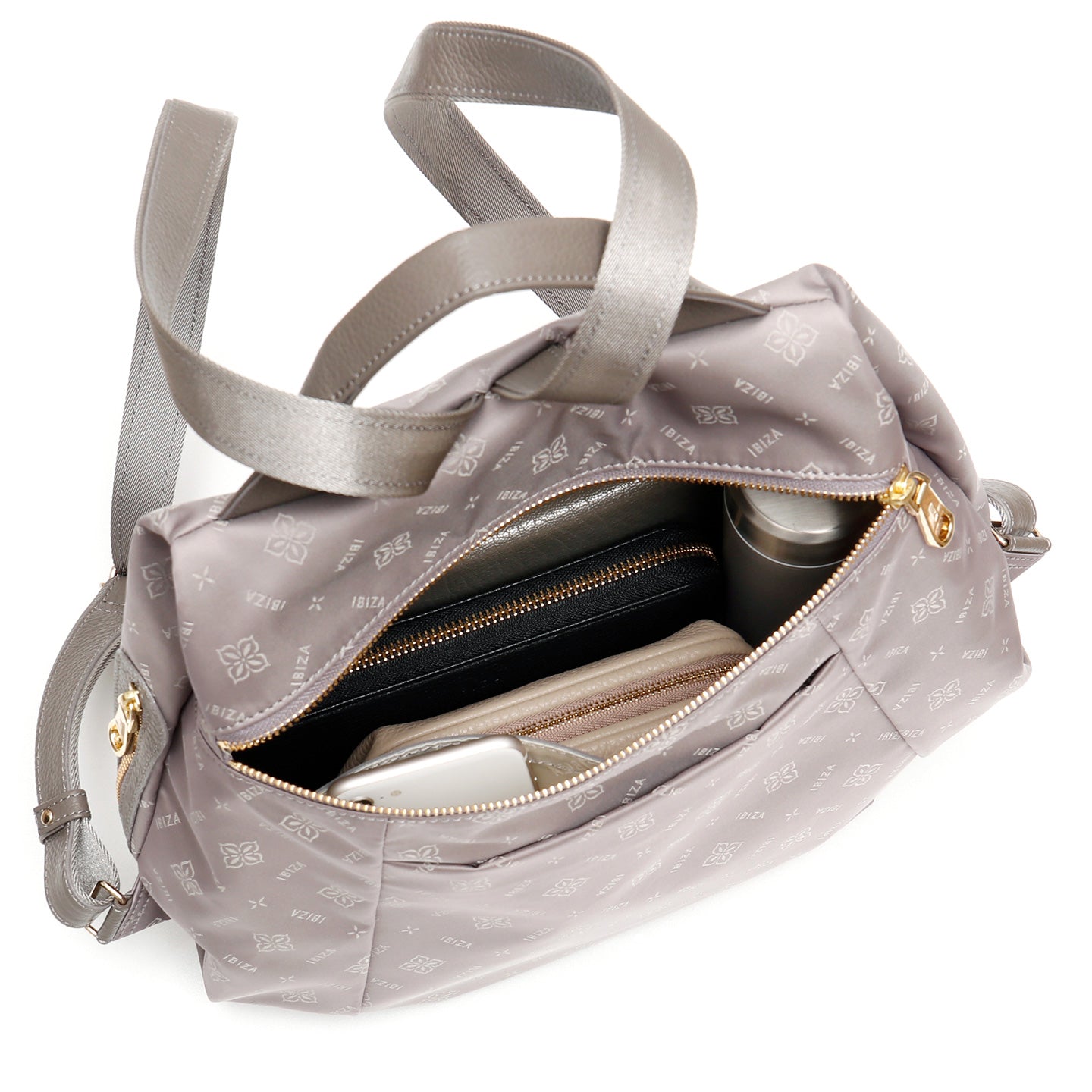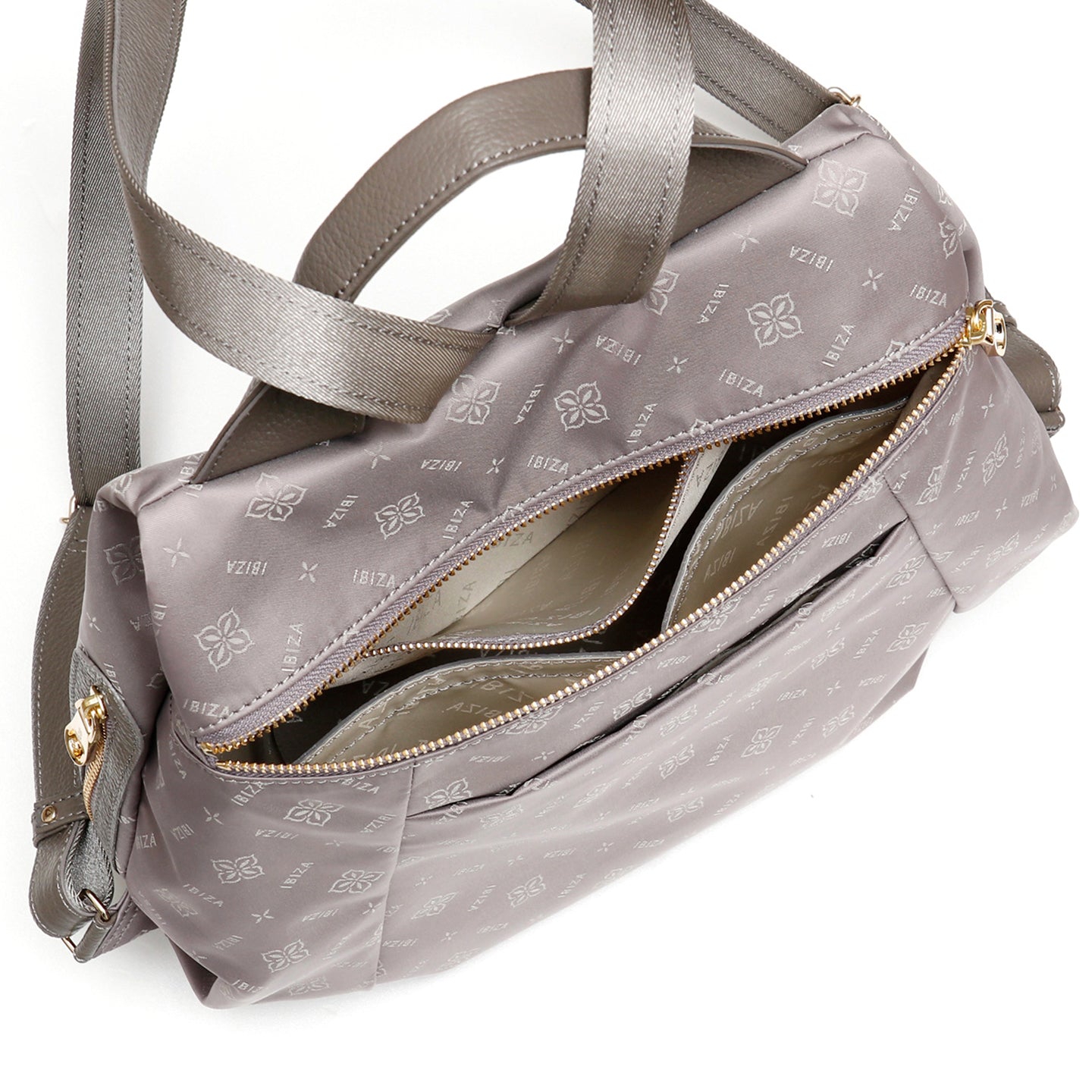 イビサ島のオリーブの花とブランドロゴのモノグラムパターンが織り込まれたナイロンを使用し、ふんわりとした立体的なフォルムをタックデザインで表現しました。