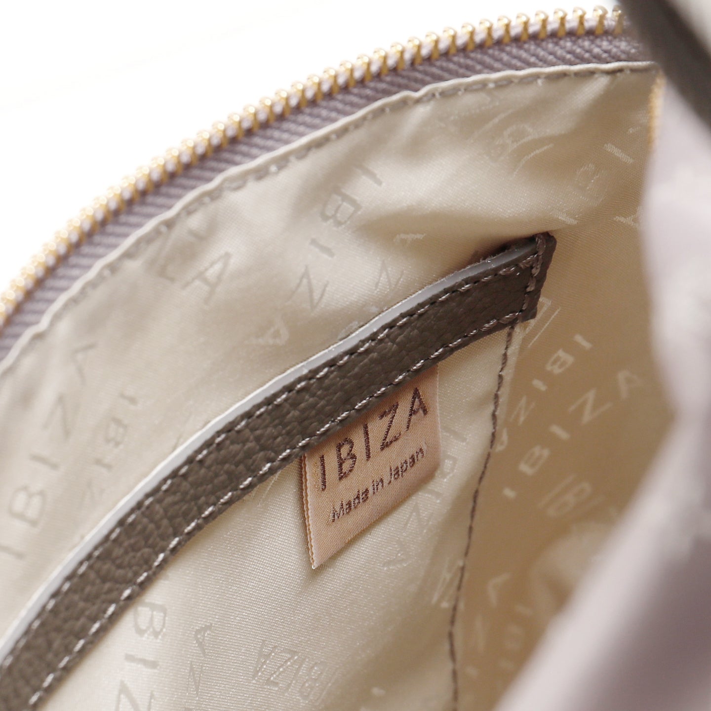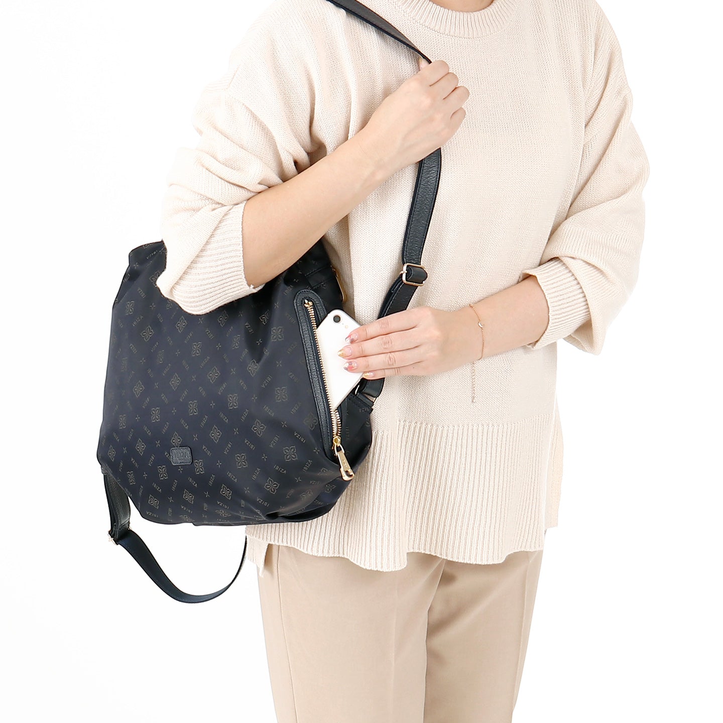 サイドのファスナーポケットは、スマートフォンやパスケースなどよく使うものの収納に便利です。ハンドルが付いているので、肩から下ろしたときもバランスよくお持ちいただけます。