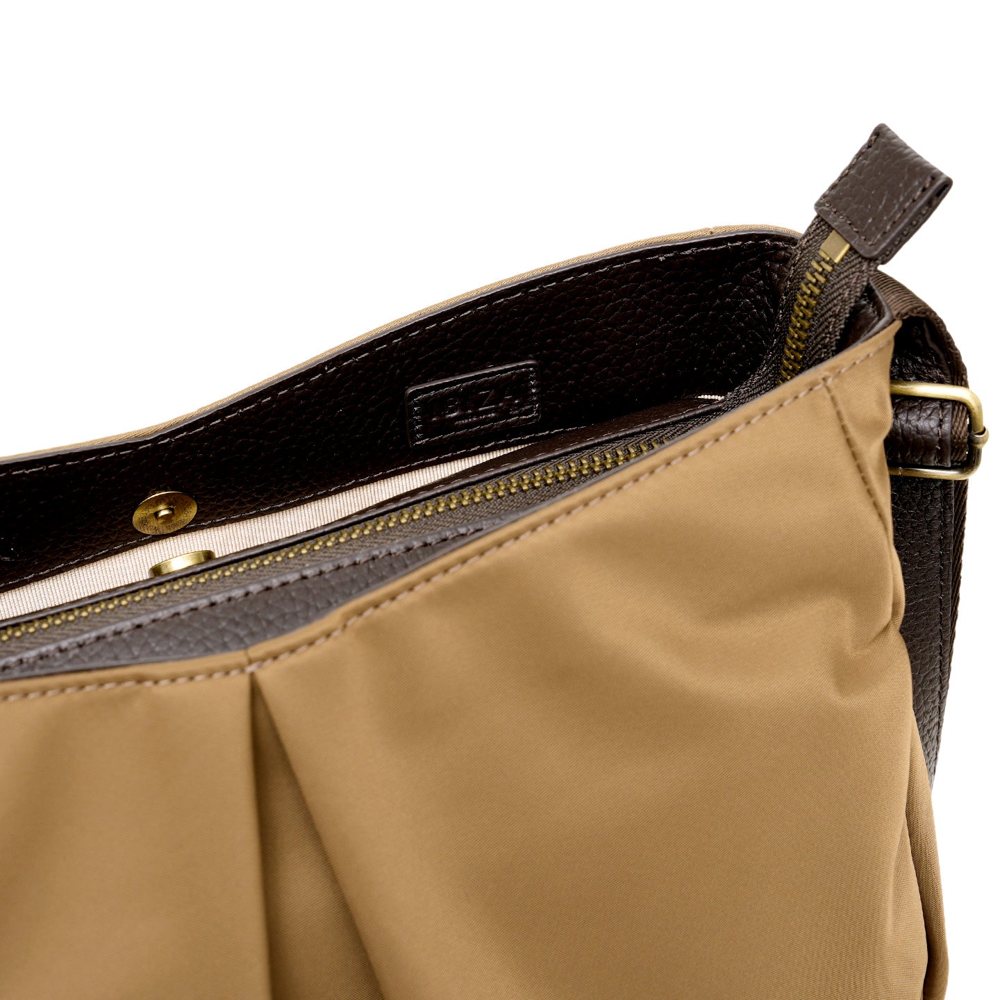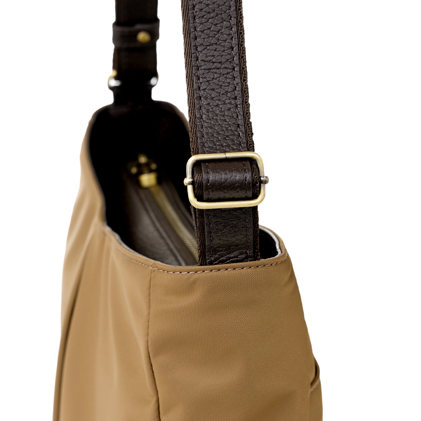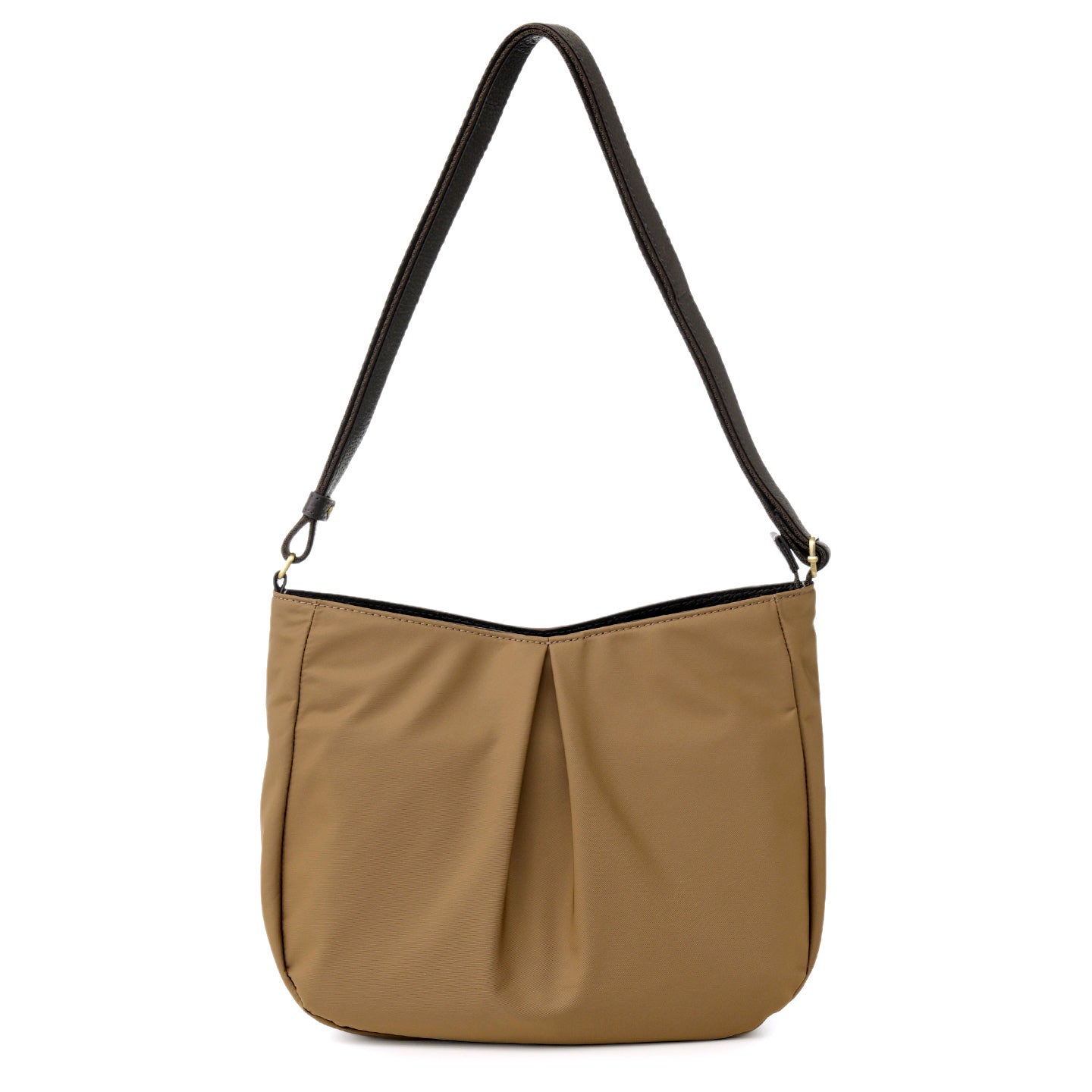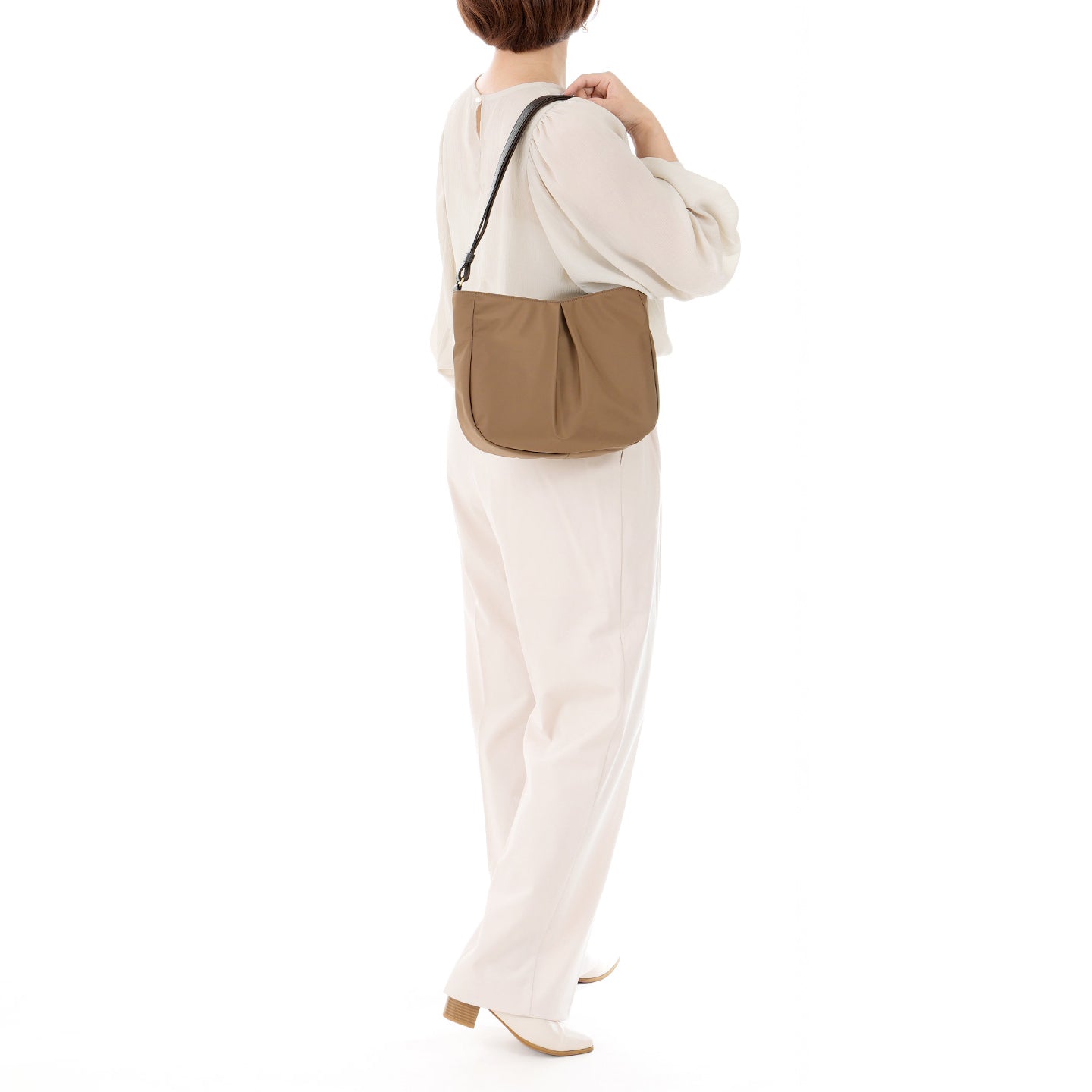 中央にタックを入れることで自然な立体感が生まれ、見た目の美しさと収納力を両立しました。あおりポケットには携帯電話やパスケースがすっきり収まり、出し入れもスムーズ。軽やかな仕上がりで長時間持っても快適にお使いいただけます。ショルダー紐は長さ調整ができ、肩掛けにも斜め掛けにも対応します。