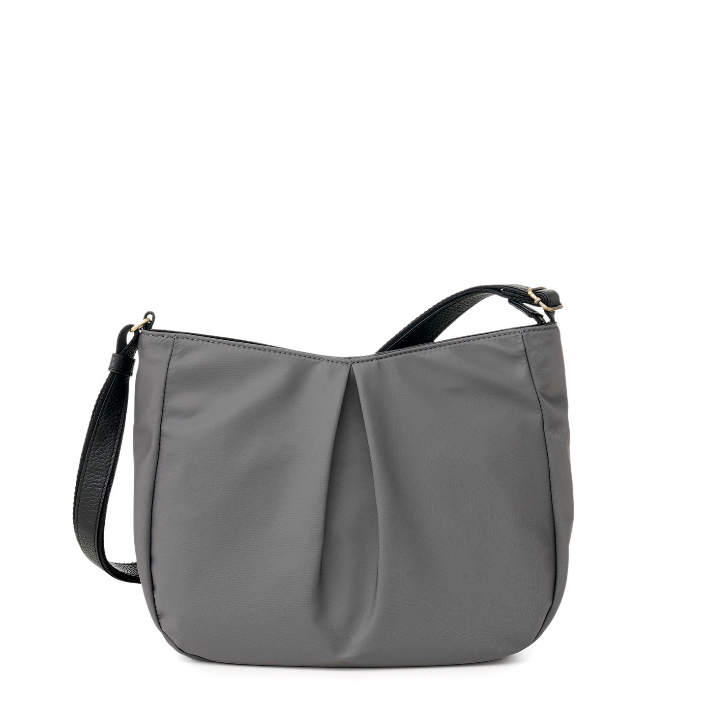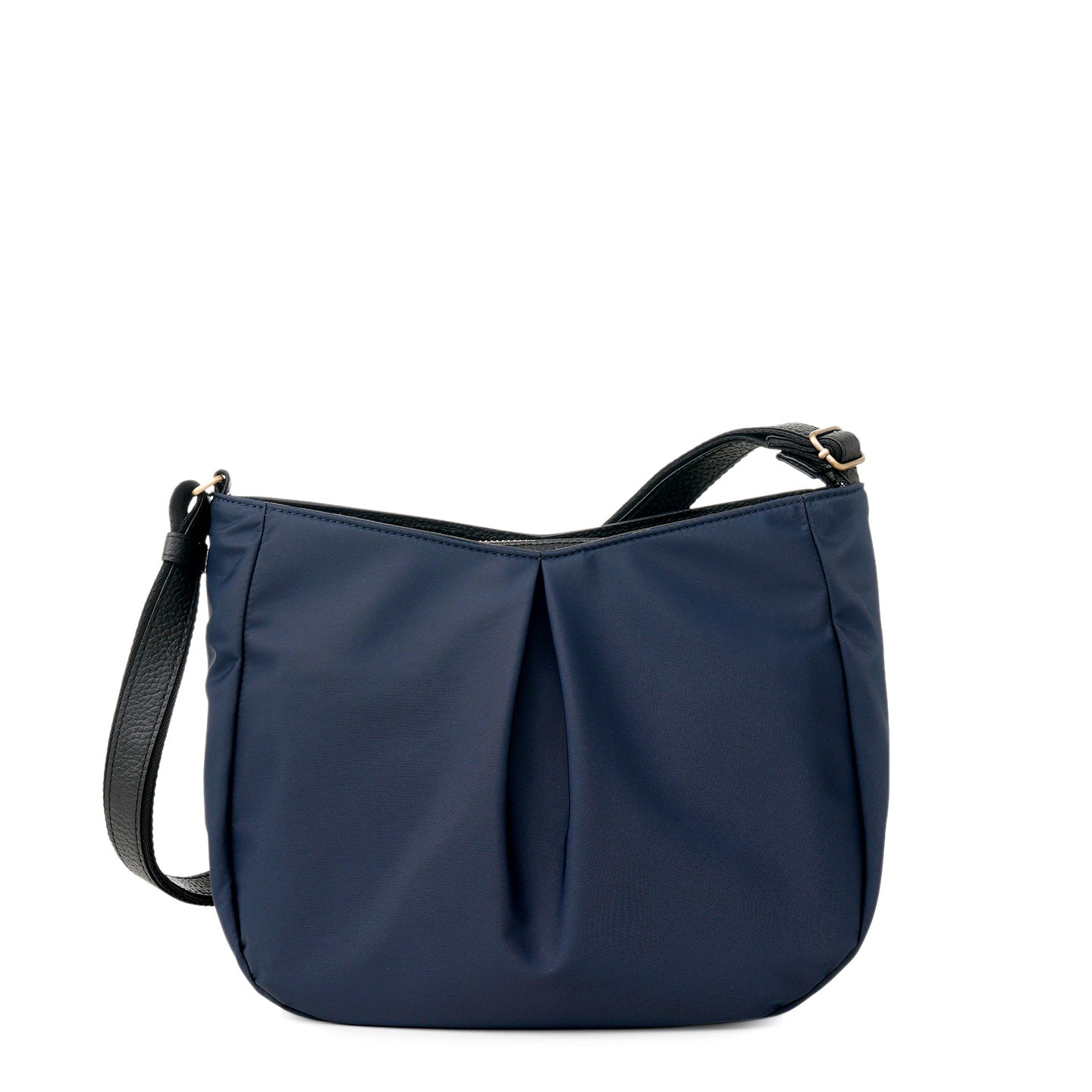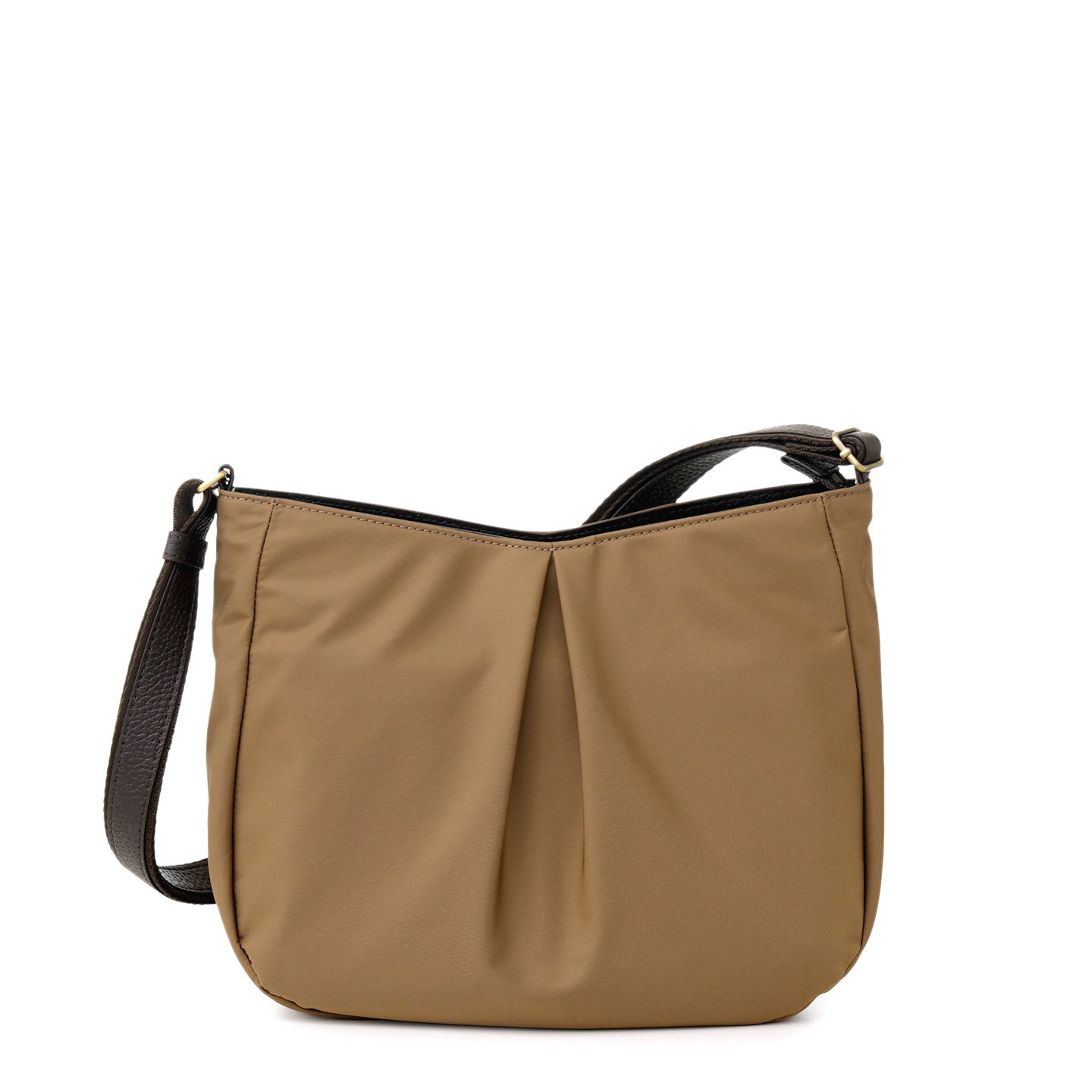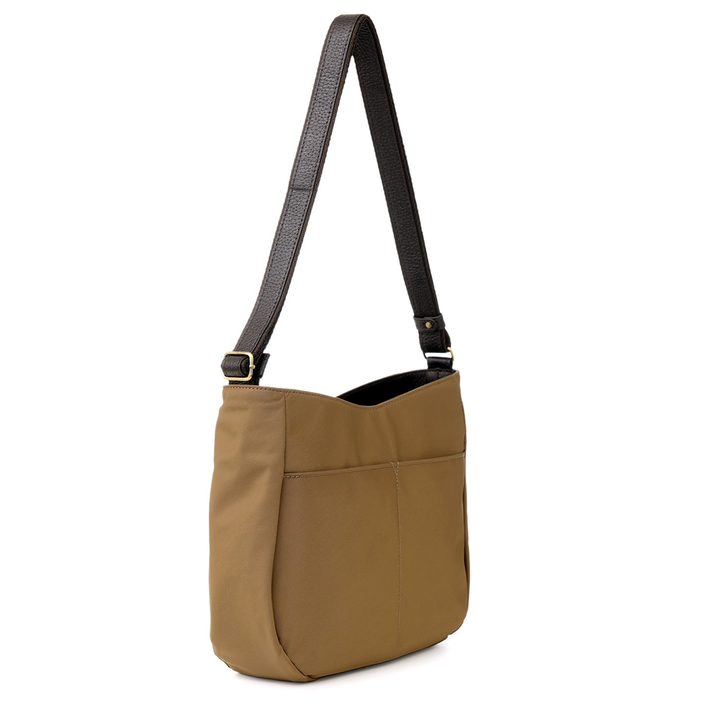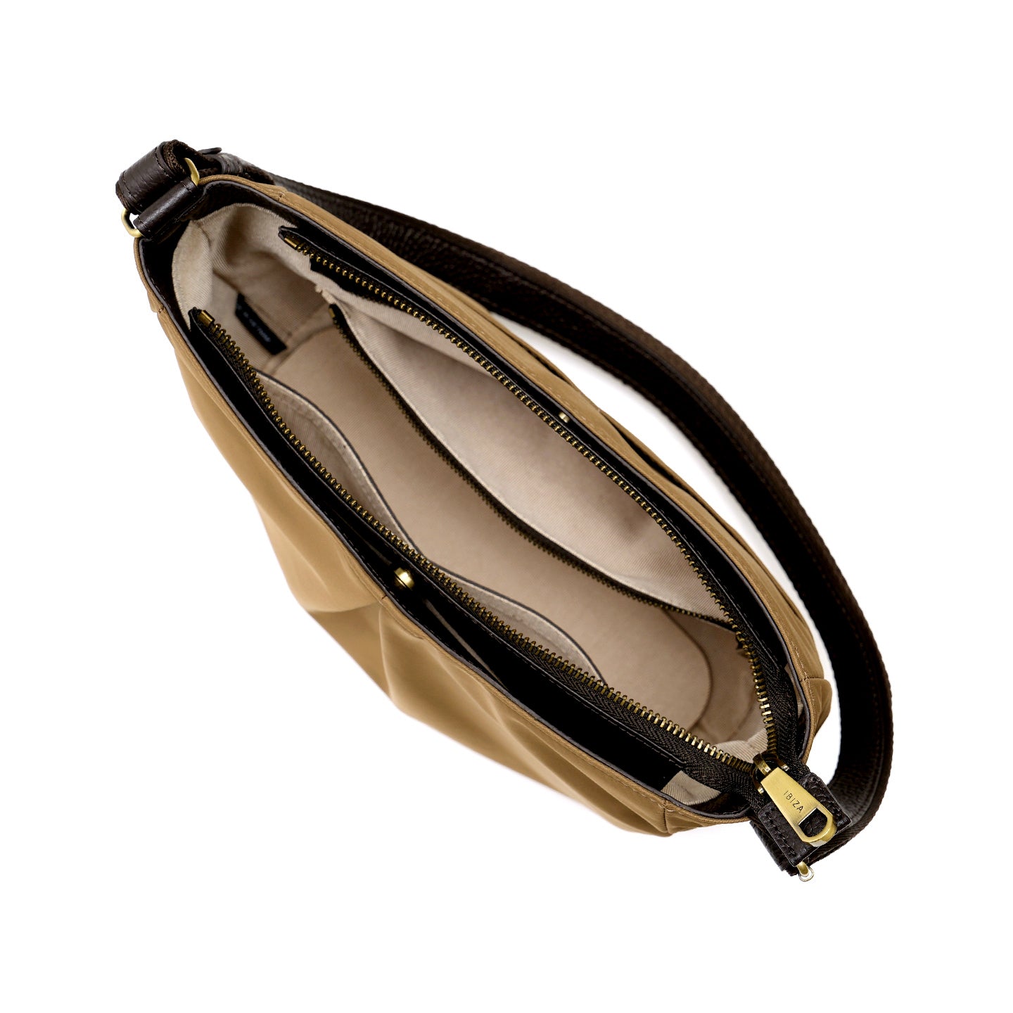 中央にタックを入れることで自然な立体感が生まれ、見た目の美しさと収納力を両立しました。あおりポケットには携帯電話やパスケースがすっきり収まり、出し入れもスムーズ。軽やかな仕上がりで長時間持っても快適にお使いいただけます。ショルダー紐は長さ調整ができ、肩掛けにも斜め掛けにも対応します。