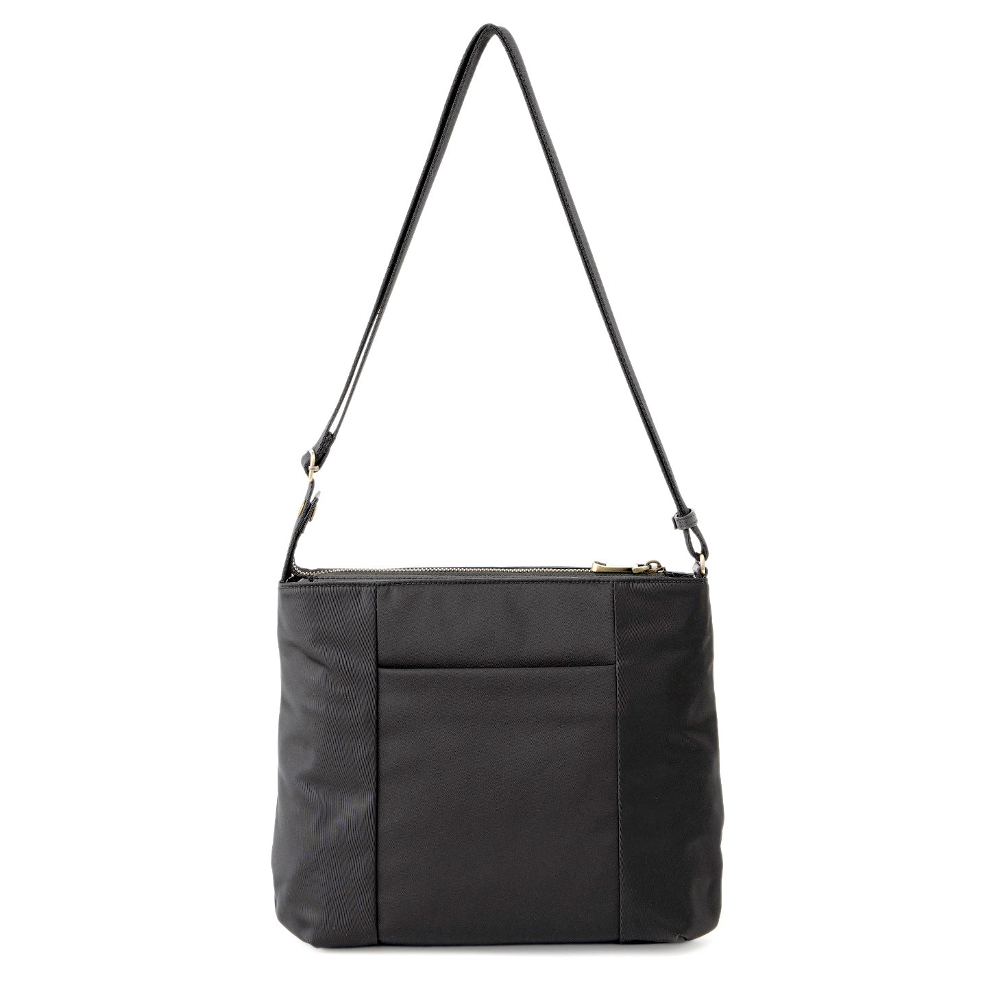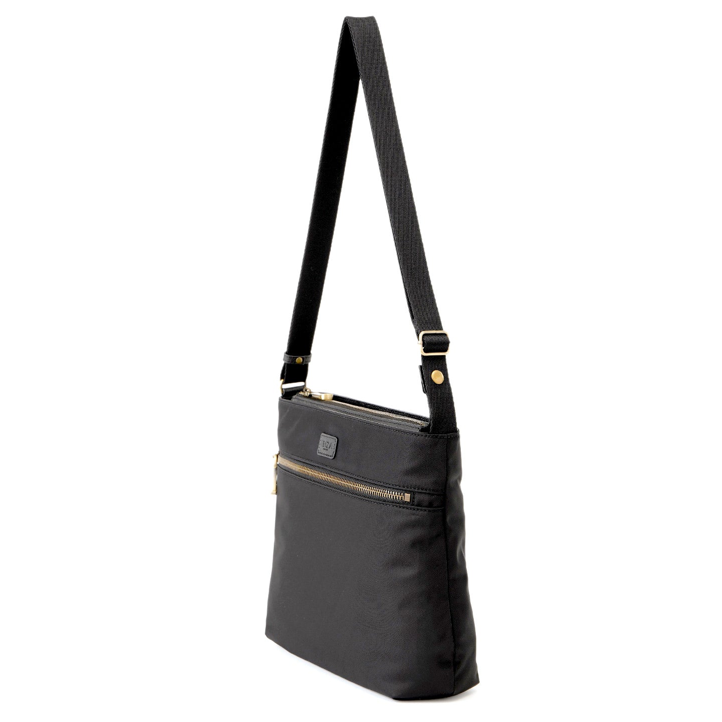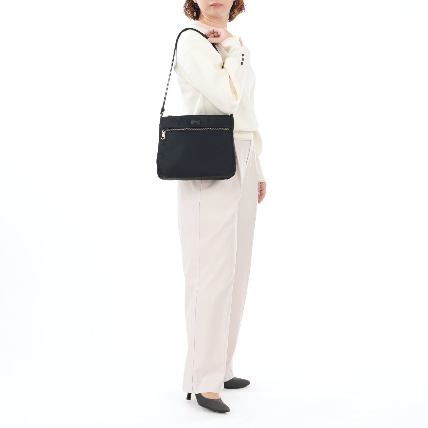 フロントに大きなファスナーポケットを備えた、軽やかに持てるスクエア型のショルダーバッグです。光沢のある丈夫なナイロン素材を使用し、前後のあおりポケットにはスマートフォンやパスケースがすっきり収まり、出し入れもスムーズです。