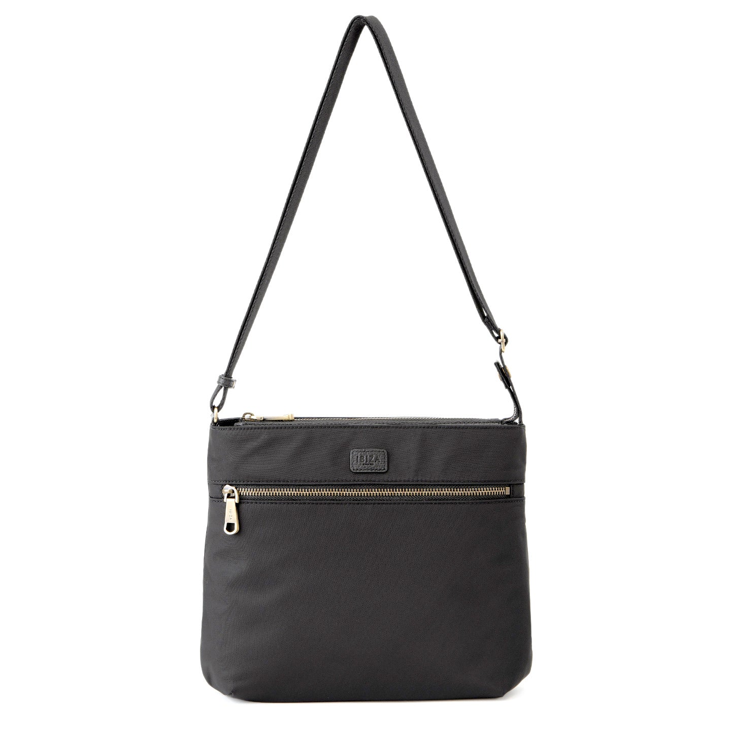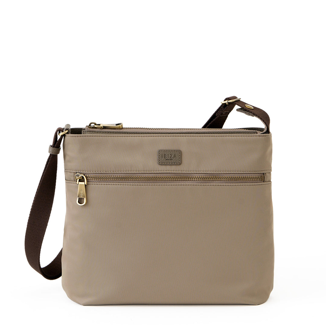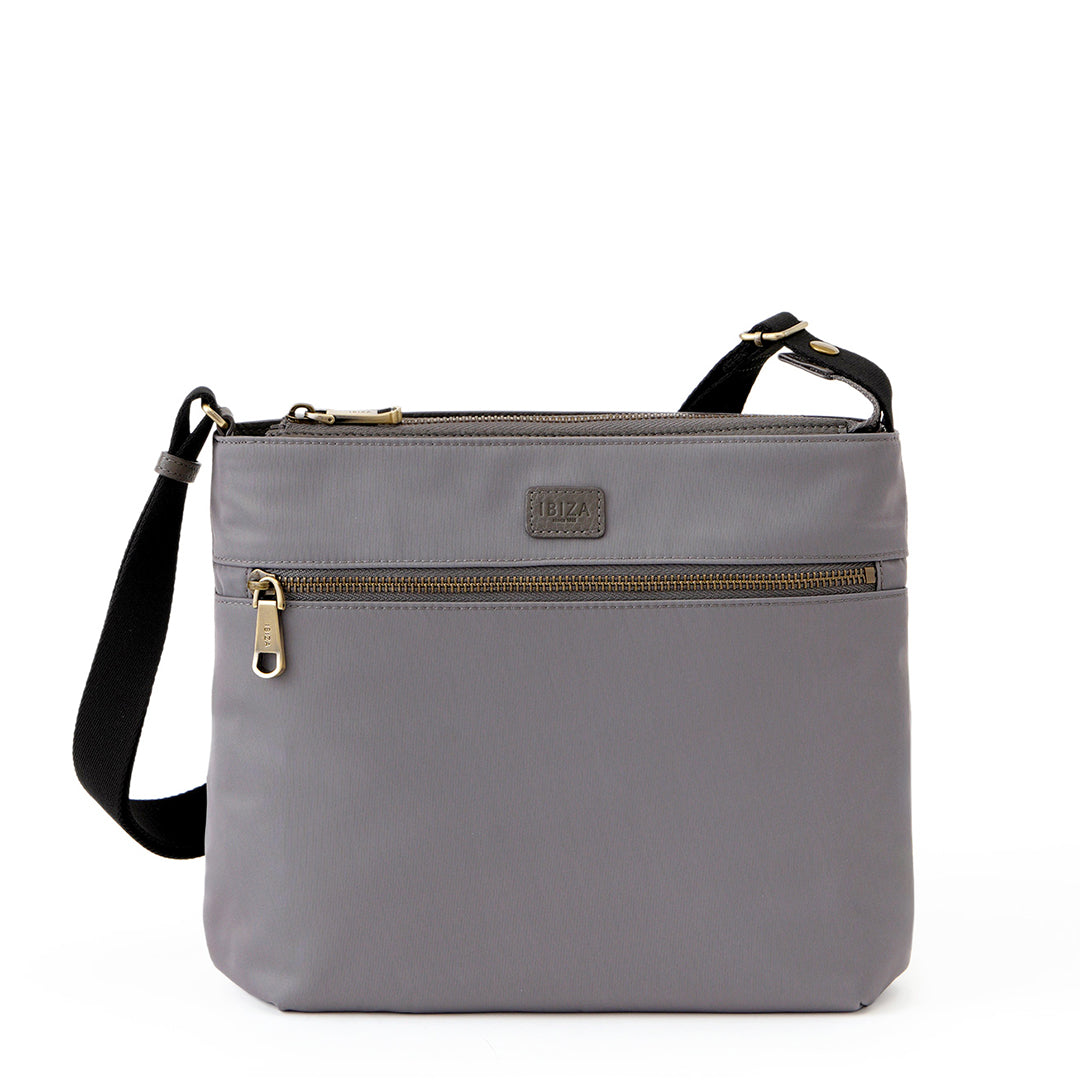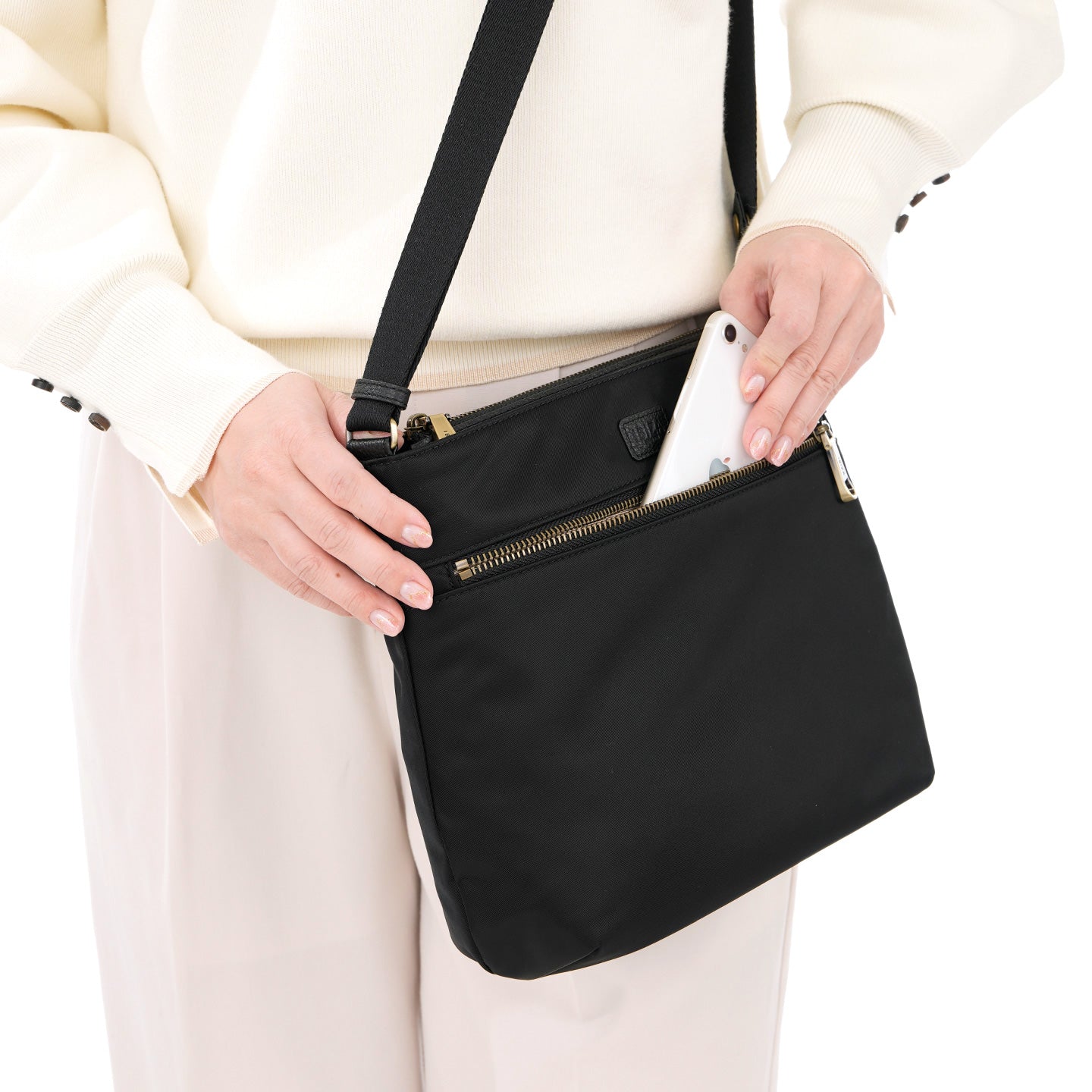 フロントに大きなファスナーポケットを備えた、軽やかに持てるスクエア型のショルダーバッグです。光沢のある丈夫なナイロン素材を使用し、前後のあおりポケットにはスマートフォンやパスケースがすっきり収まり、出し入れもスムーズです。