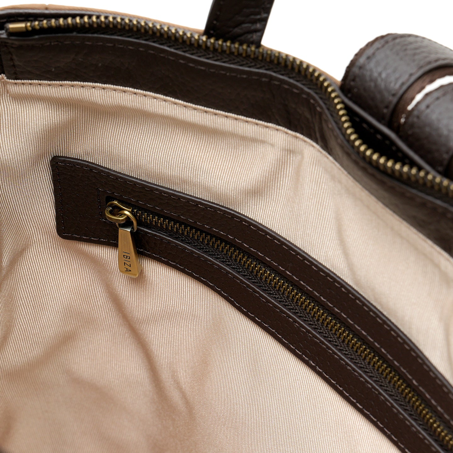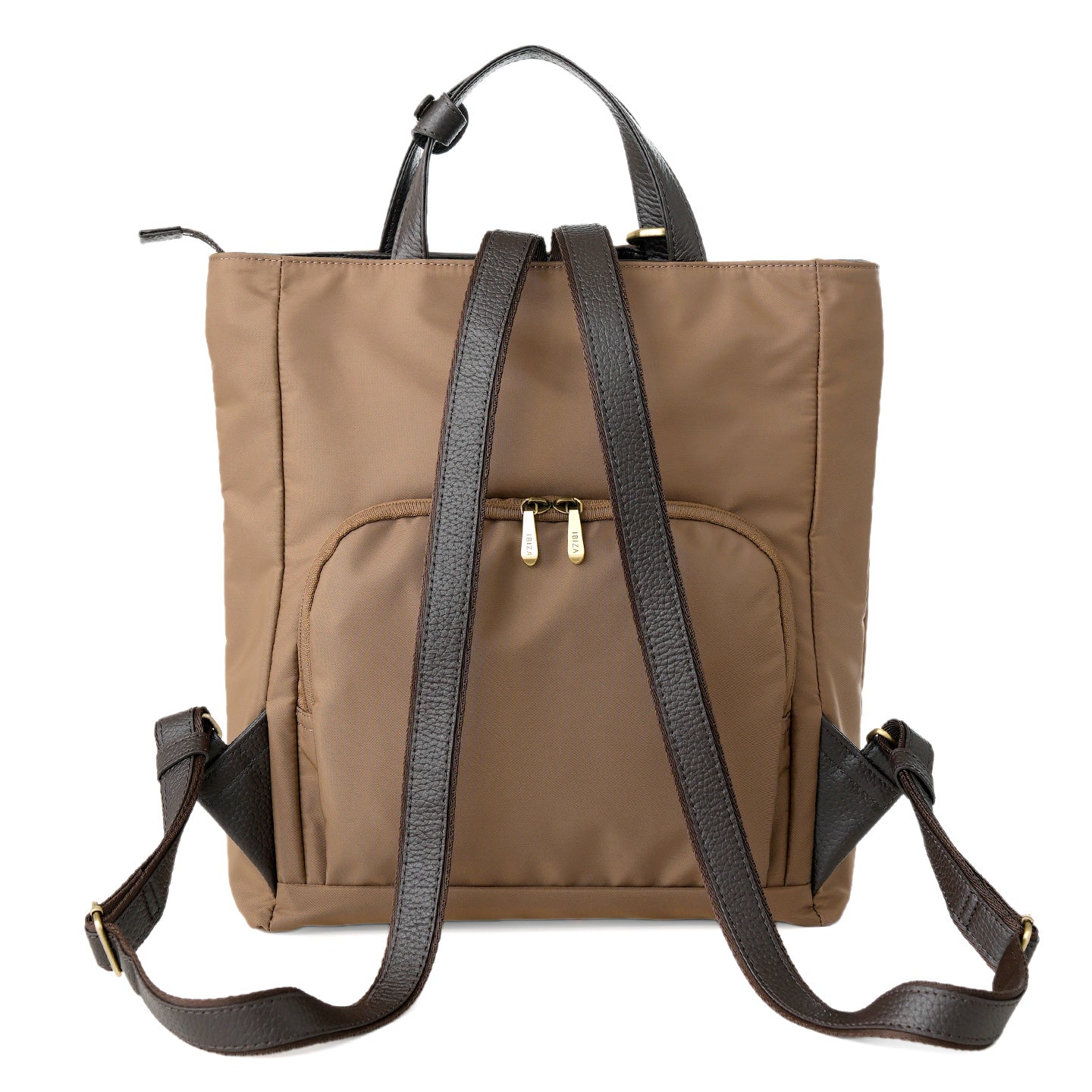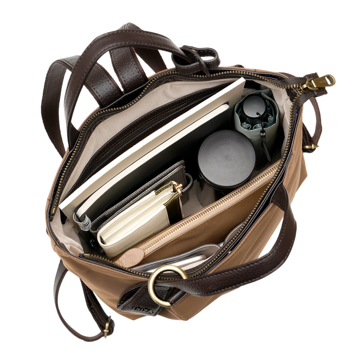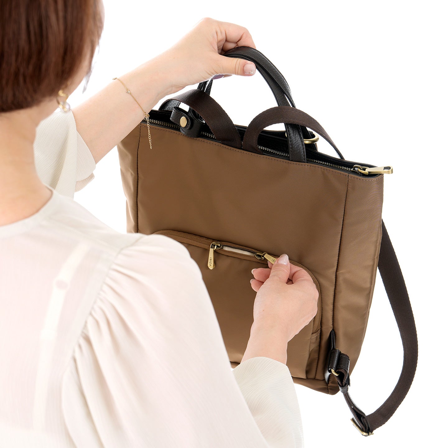 背面には貴重品も収納できるファスナーポケットを配し、防犯面も安心のつくり。用途別に使えるたくさんのポケットがあり、スマートフォンやパスケース、鍵などの細かいものの収納にも便利です。