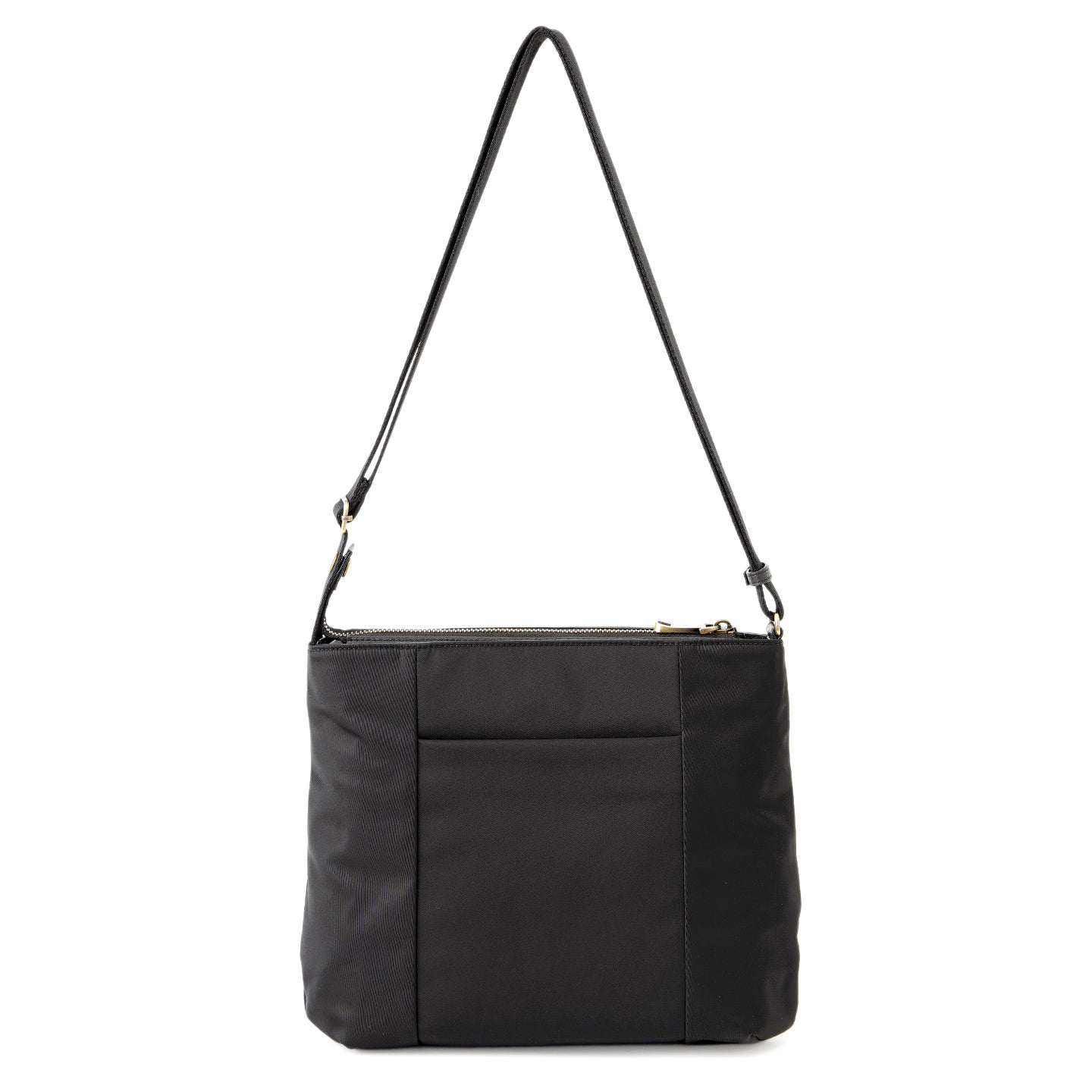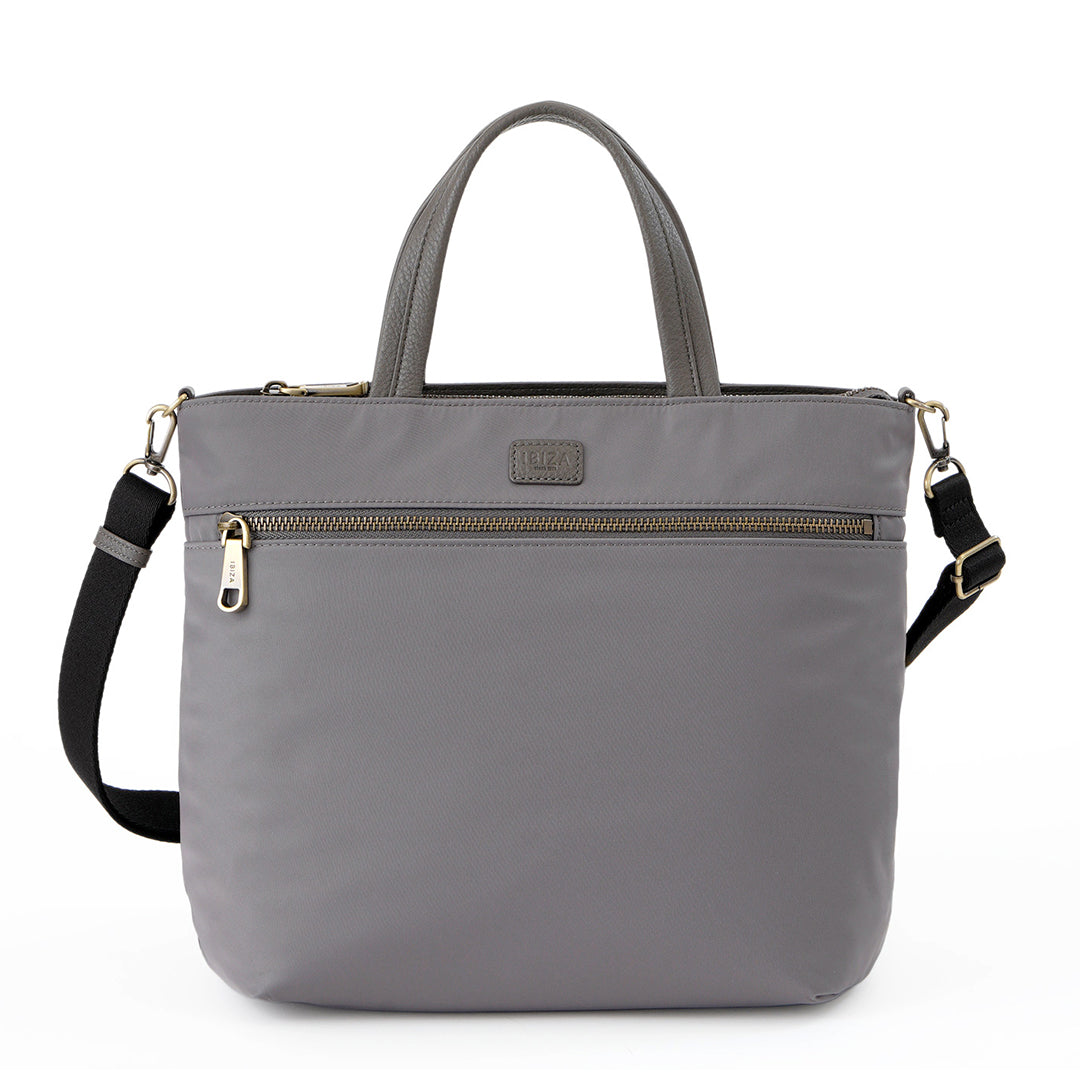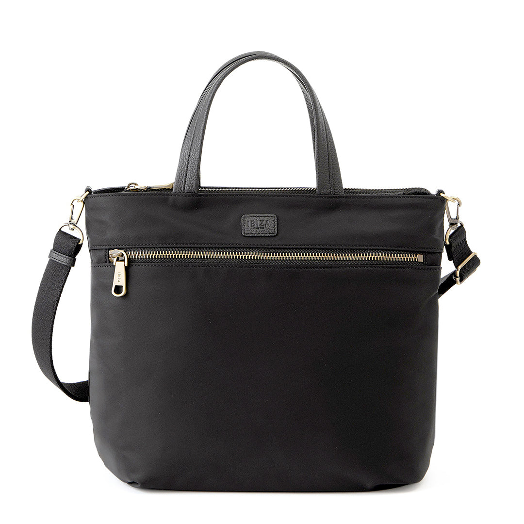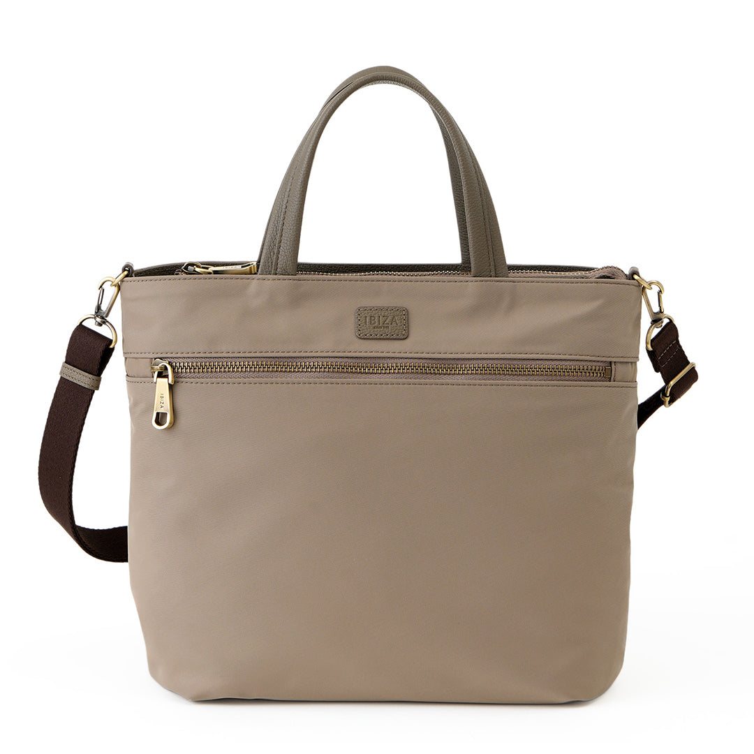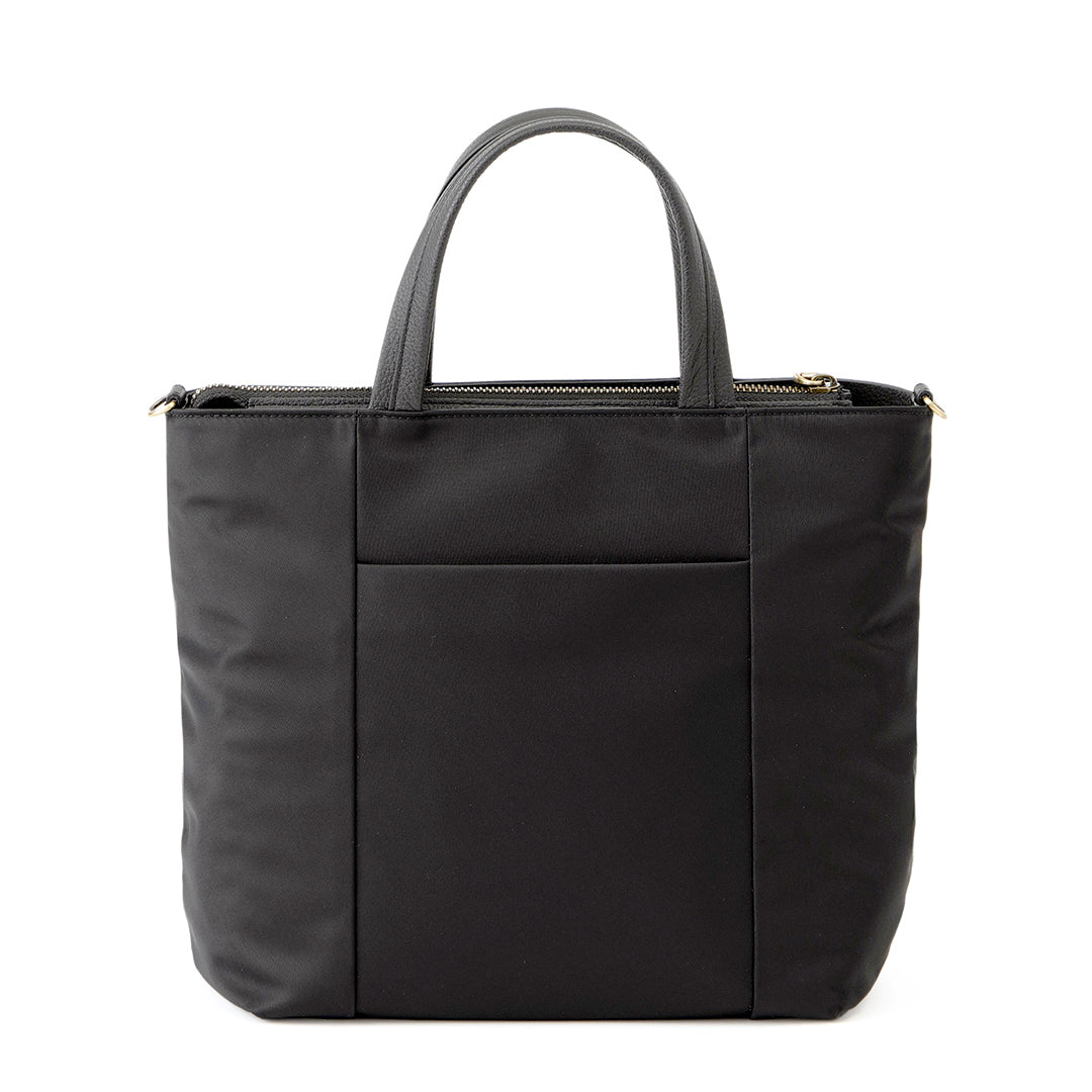 フロントに大きなファスナーポケットを配した、毎日に使いやすいスクエア型の2WAYバッグです。上品な光沢のある丈夫なナイロン素材に、ポイントでレザーをあしらい、ほどよく上品な印象に仕上げました。