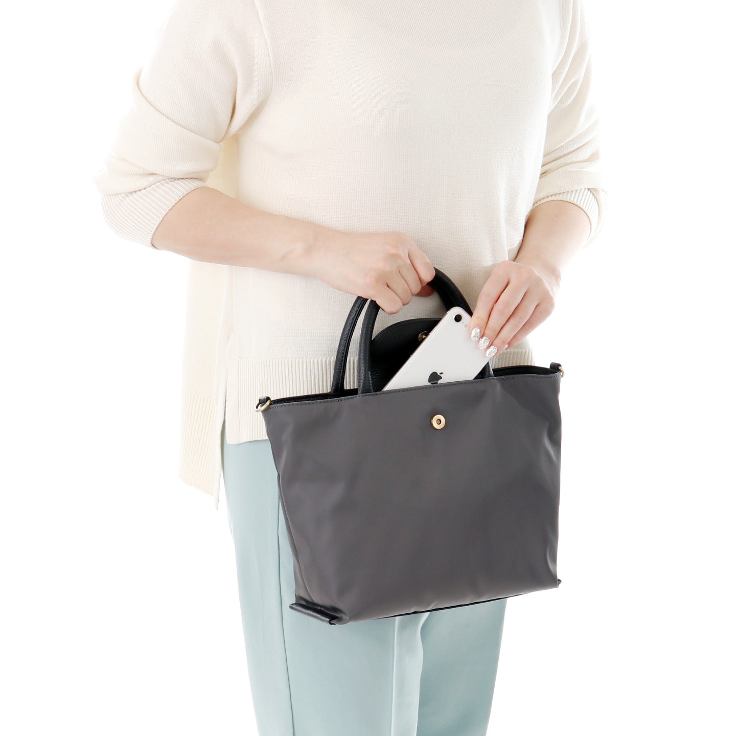 丈夫で軽量なナイロン素材に、やわらかく手になじむ牛革をバランスよく配し、カジュアルになりがちなナイロンバッグをエレガントなデザインで仕上げました。