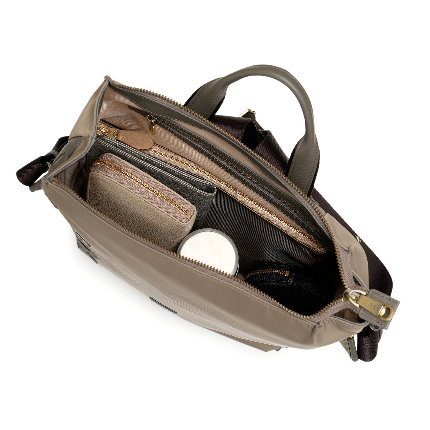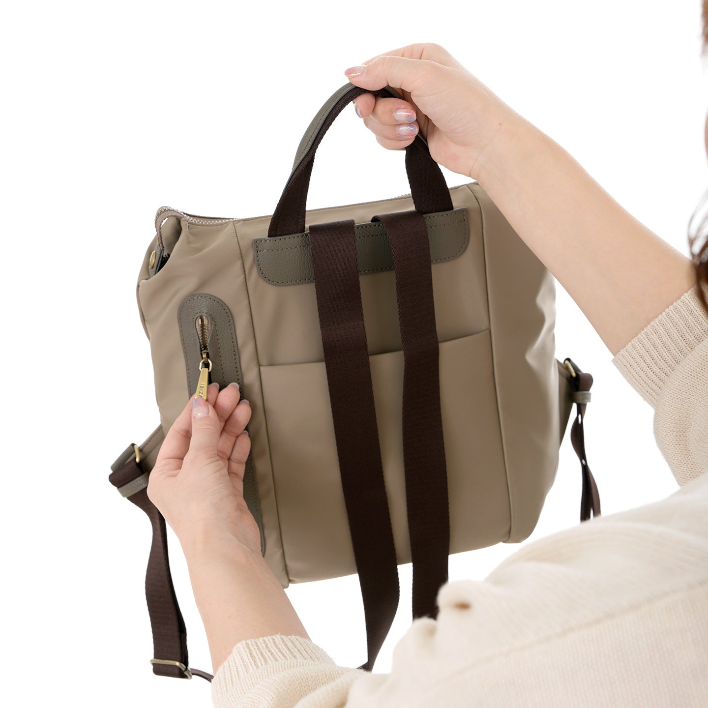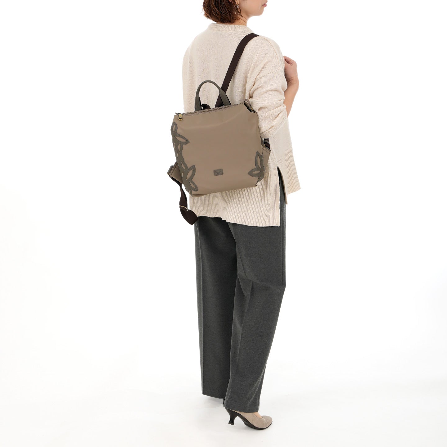 バッグの内外には用途別に配したポケットがあり、細かなものも整理整頓できる安心の収納力。ハンドルが付いているので、肩からおろしてもバランスよくお持ちいただけます。