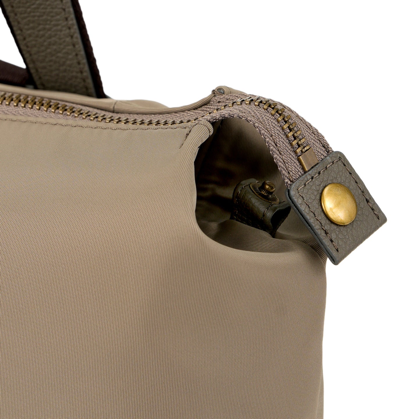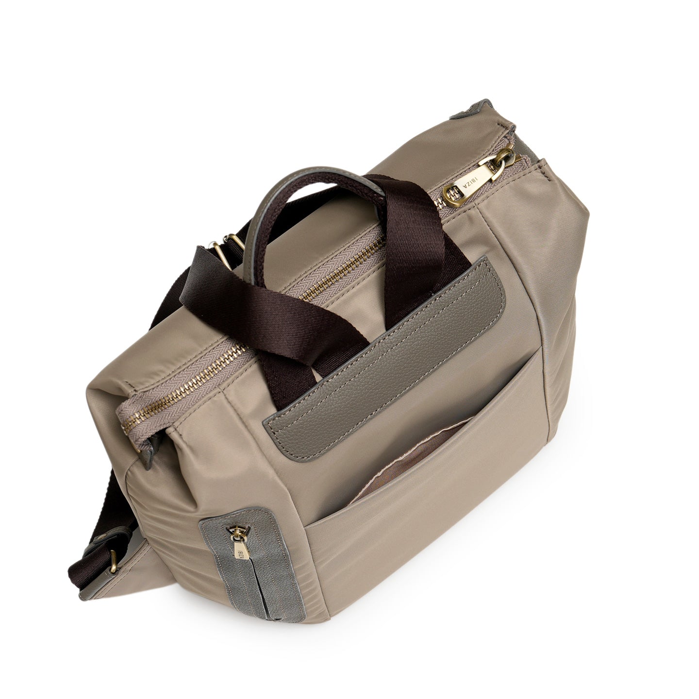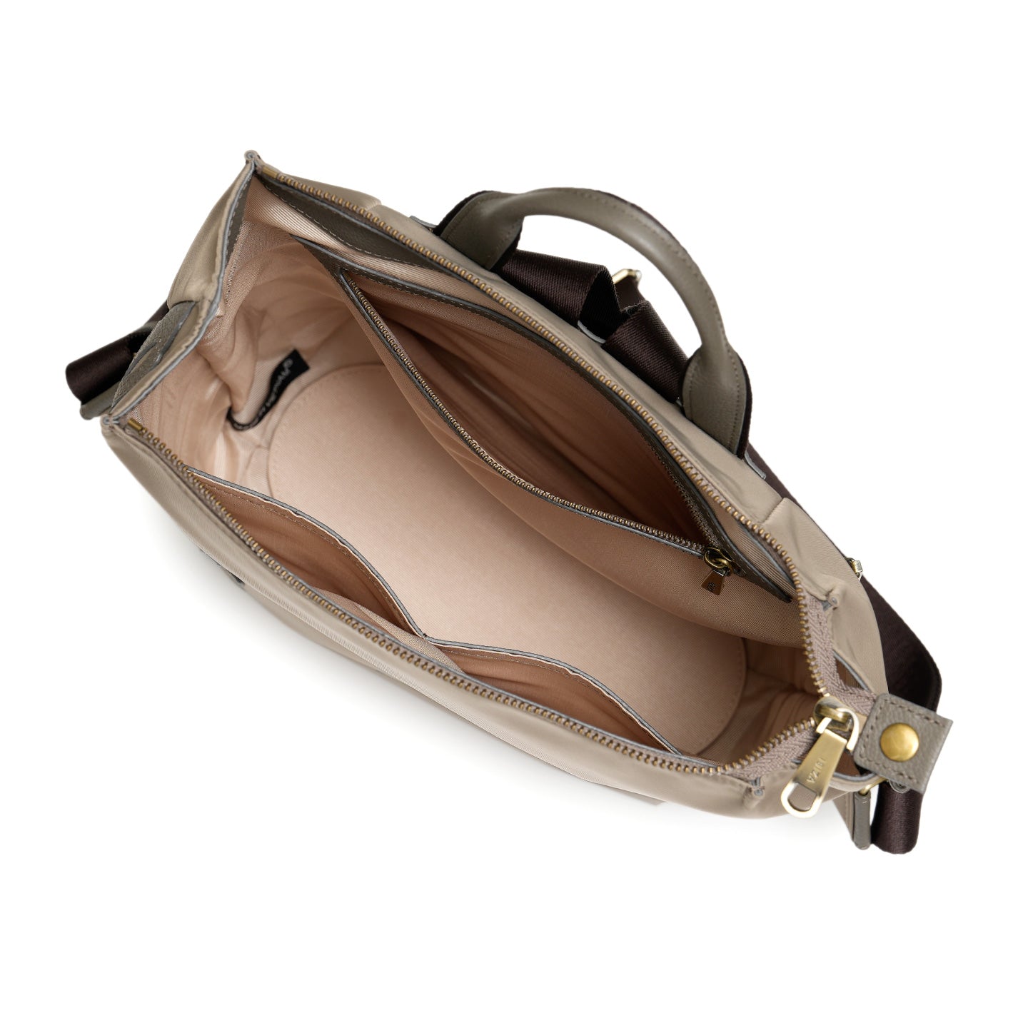 バッグの内外には用途別に配したポケットがあり、細かなものも整理整頓できる安心の収納力。ハンドルが付いているので、肩からおろしてもバランスよくお持ちいただけます。