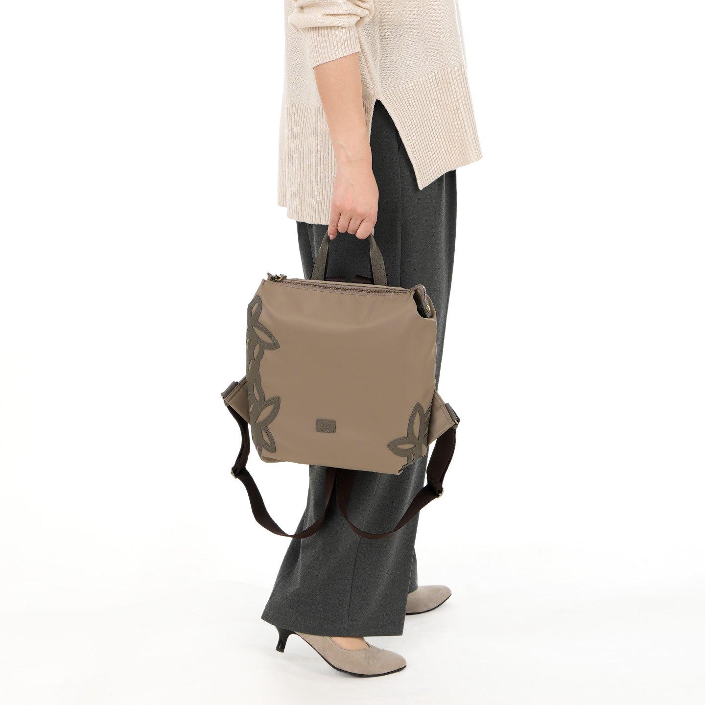 バッグの両サイドに、イビサ島に咲くブーゲンビリアをイメージしたカットワークをアシンメトリーに施したデザインが特徴です。