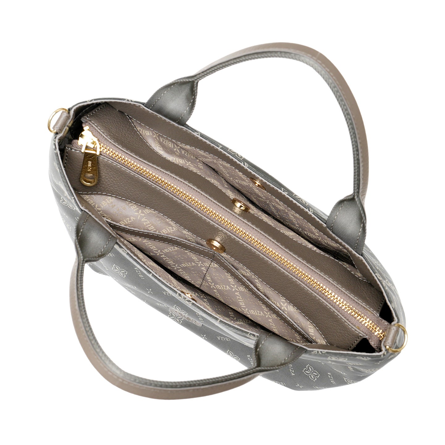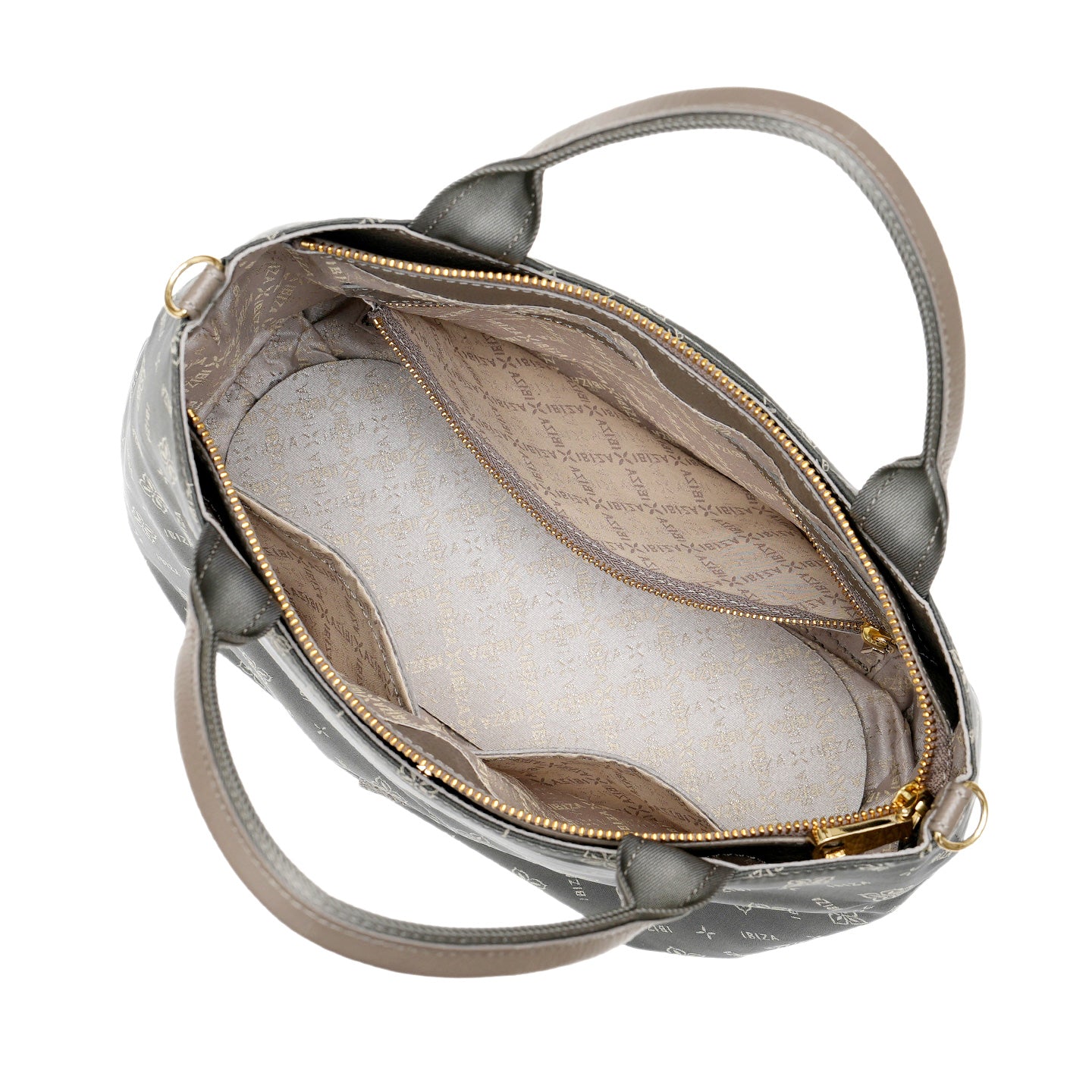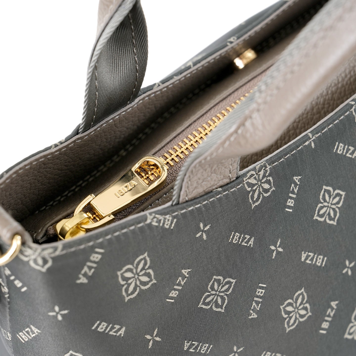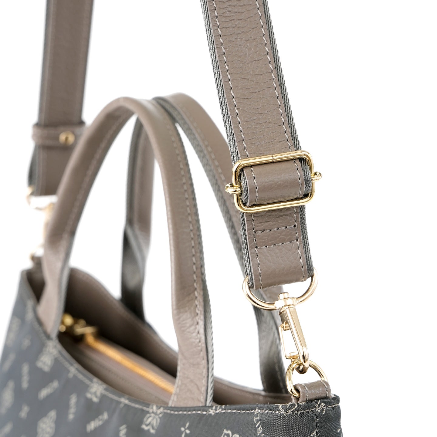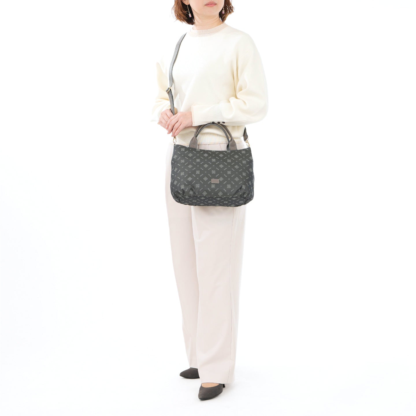 福井県で織り上げたナイロン生地に、オリーブの花とブランドロゴをモノグラムとして織り込んだ2WAYバッグです。織り模様が生むさりげない艶感と、口周りの緩やかなカーブとタックを寄せた丸みのあるフォルムが、装いにやわらかさを添えてくれます。