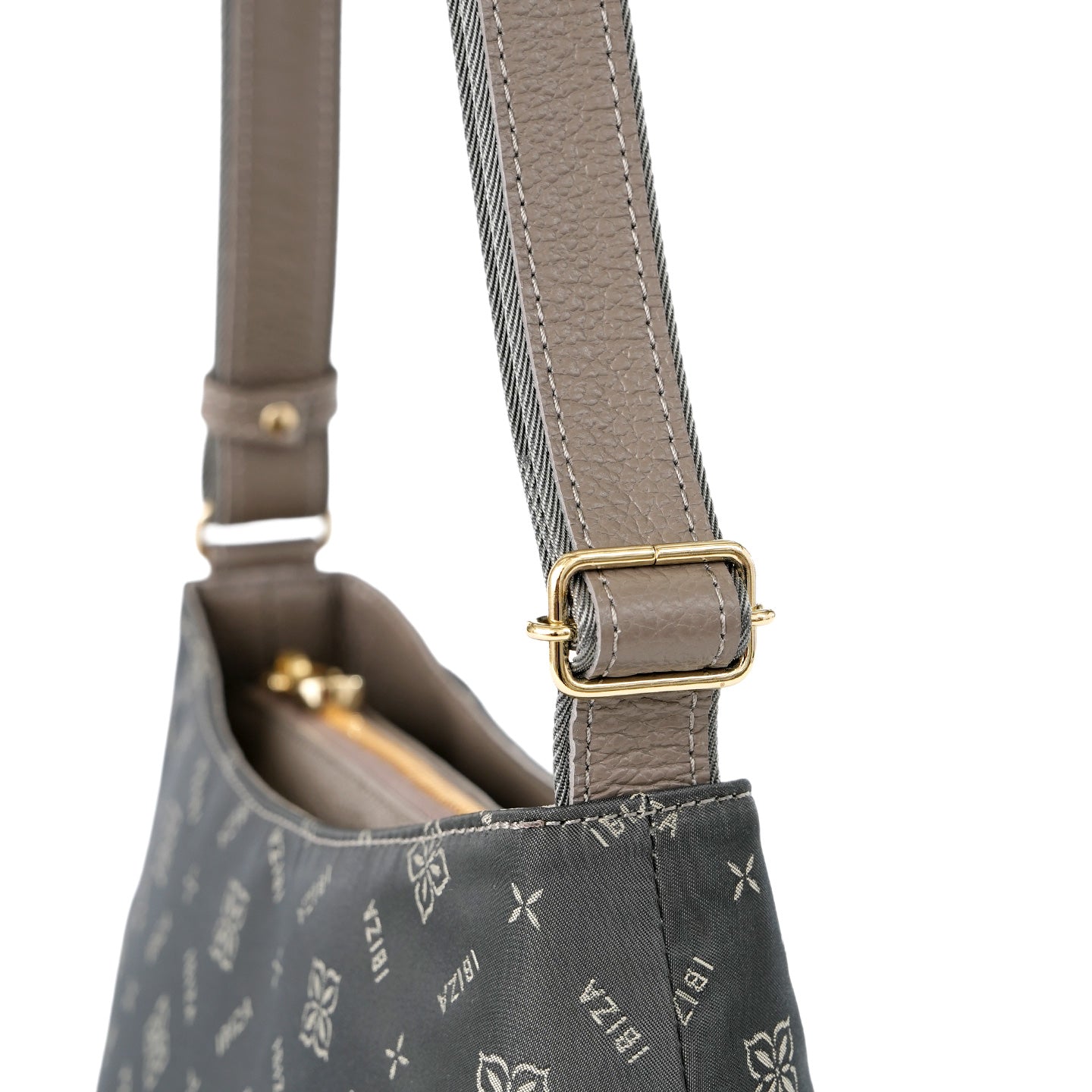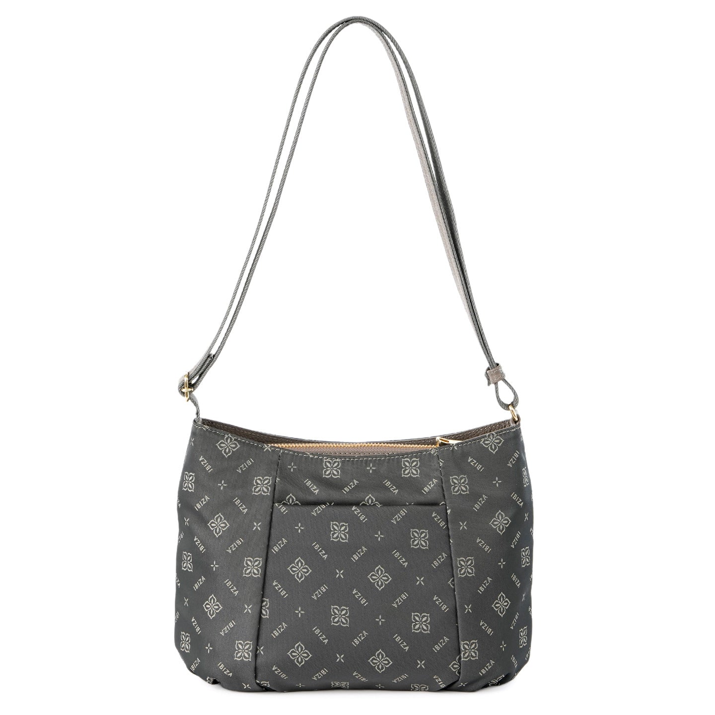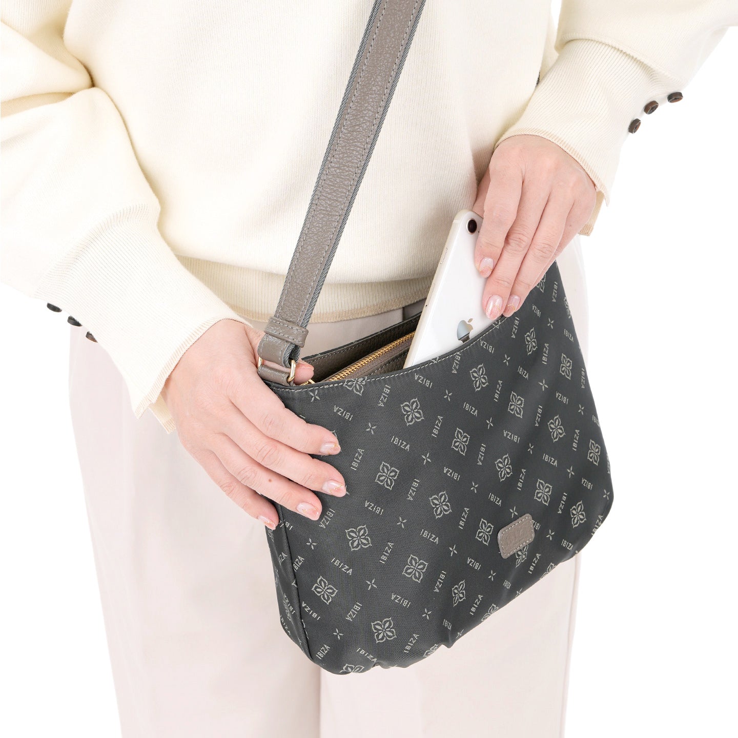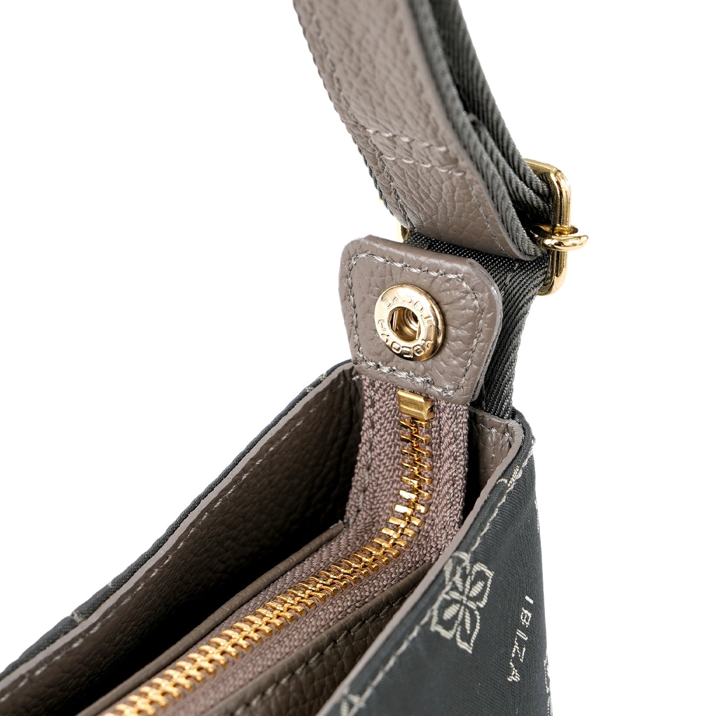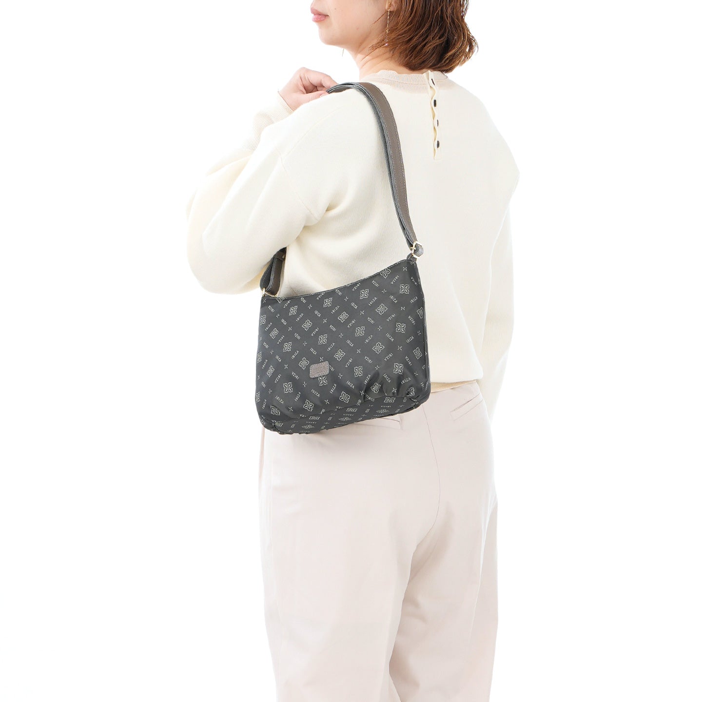 福井県で丁寧に織り上げたナイロンテキスタイルに、オリーブの花とブランドロゴを組み合わせたモノグラムを織り込んだショルダーバッグです。織り模様が生むさりげない艶感と、口周りの緩やかなカーブとタックを寄せた丸みのあるフォルムが、装いにやわらかさを添えてくれます。